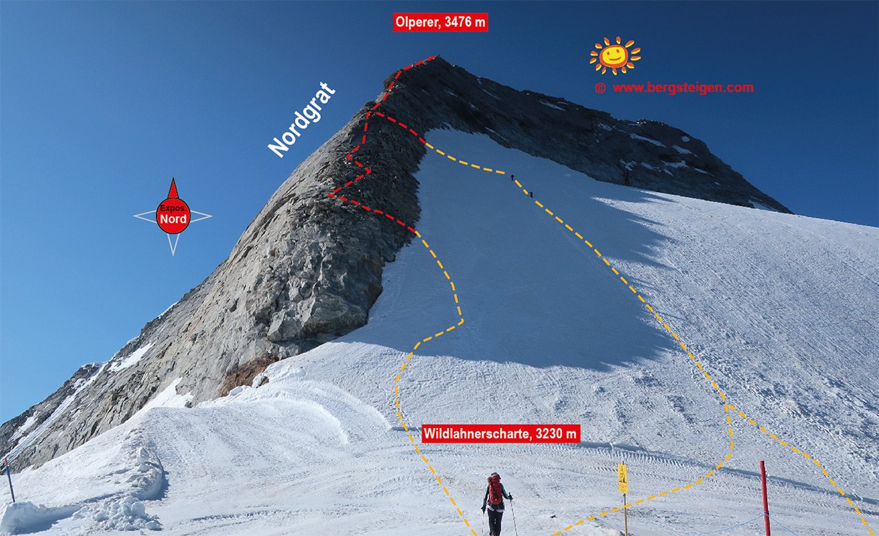 Siehe Topo. Im direkten Aufstieg von der Geraer Hütte, die in wilder Umgebung liegt (mit Blick auf den Fußstein und die Sagwand;) geht es zuerst über Almwiesen und eine Gletschermoräne zum Olperergletscher. Man quert unter einem eindrucksvollen Gletscherbruch in die Wildlahnerscharte und steigt von dieser den markanten Grat zum Gipfel auf.