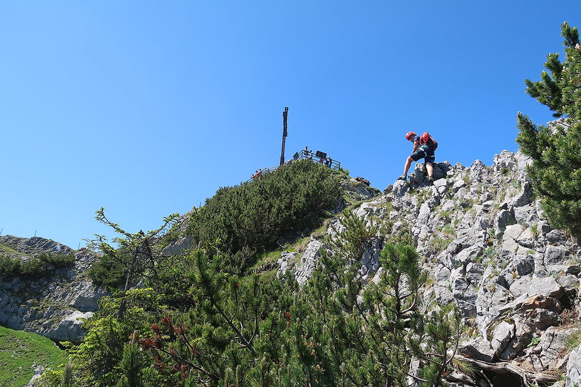 16. Seillänge (1-, ca. 150 m): Durch Latschen (Bohrhaken) aufwärts und am Ende direkt zum Kreuz des Geierecks.