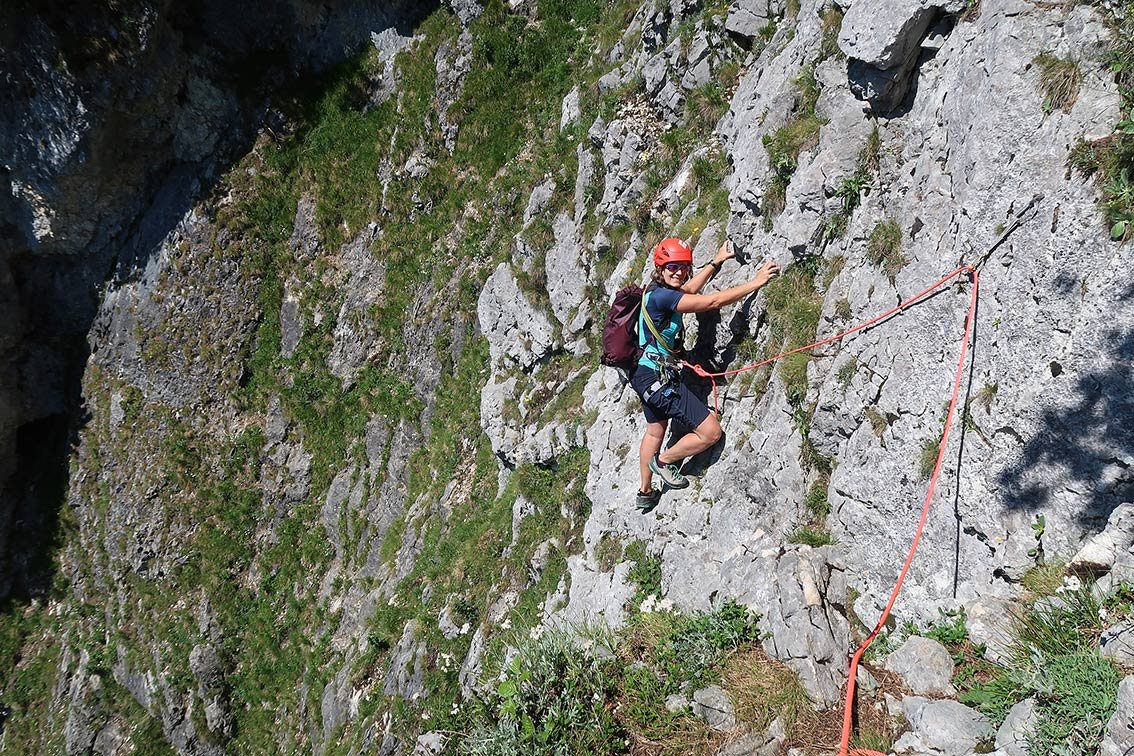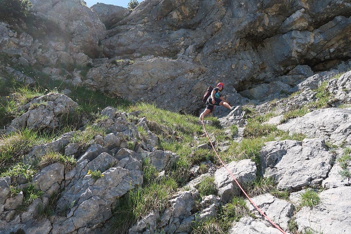 4. Seillänge (2, 48 m): Weiter unterhalb des Grates queren (2 Bohrhaken) bis man zu einer Stufe kommt (3 Bohrhaken), über diese aufwärts (links steckt ein Bohrhaken im steilen Gras, der ist aber etwas abseits der Route) bis man unterhalb einer überhängenden Felswand bei Bohrhaken Stand macht.