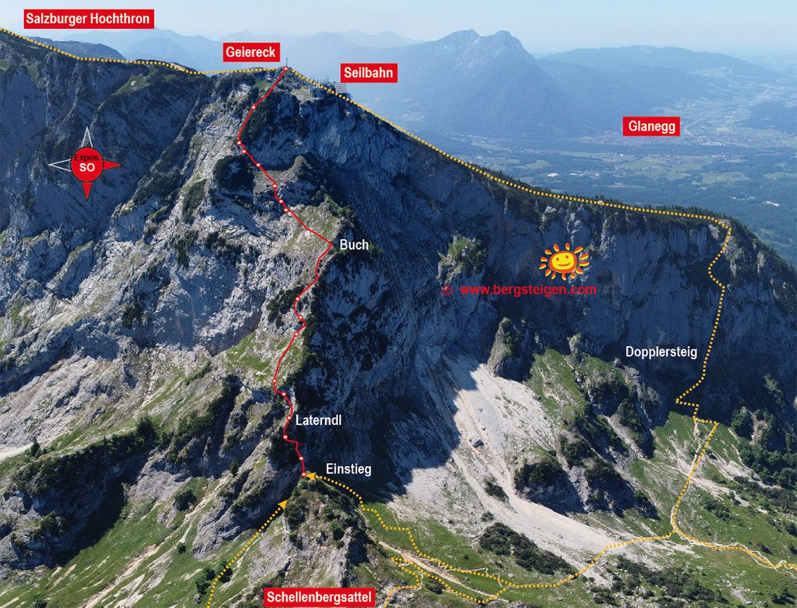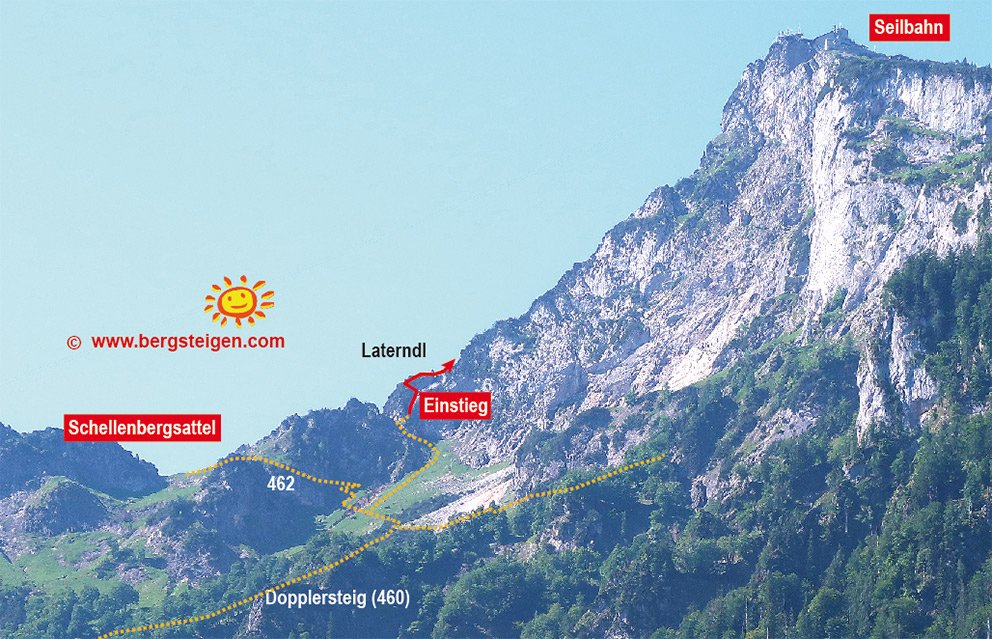 Vom Dopplersteig rechts vom Schellenbergsattel in eine Scharte (am Ende kurz 1-). In der Scharte sind alte Metallstangen (dorthin kommt man auch von der Toni-Lenz-Hütte kommend, man steigt vor dem Schellenbergsattel über sehr steiles Gras zur Scharte). Man klettert ein paar Meter über einen Zackengrat und findet dahinter einen Bügel (Einstieg Ostgrat Laterndl).