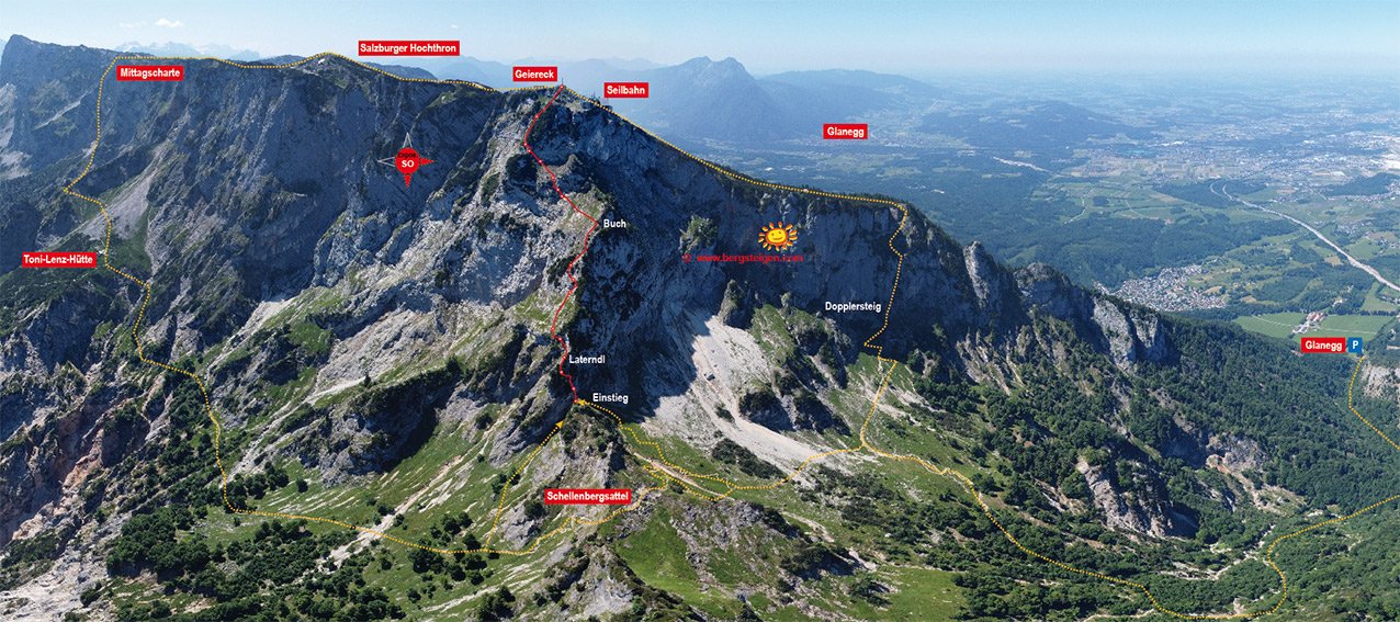 Vom Geiereck entweder über den Doppler oder den Reitsteig wieder zurück zum Ausgangspunkt. Wer noch etwas überschüssige Energie hat, kann zum Salzburger Hochthron wandern, dort in den Mittagscharte absteigen und auf dem Thomas Eder Steig (toller Höhlenabstieg) hinunter zur Toni-Lenz-Hütte. Von dort auf dem Weg 462 zurück zum Schellenbergsattel und auf der anderen Seite zum schon bekannten Zustiegsweg absteigen und auf diesem ins Tal (gesamt dann 1620 Höhenmeter).