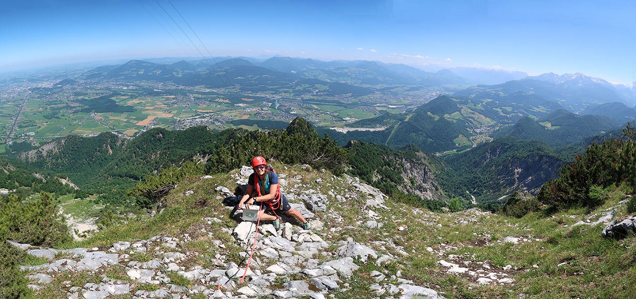 9. Seillänge (Wandbuch; ca. 180 m, gehen): Hinauf zum Wandbuch auf dem Grat, dort dann leicht links haltend im steilen Gras höher (tlw. Bohrhaken). Unterhalb der sperrenden Felsen nach links zu Bügel.