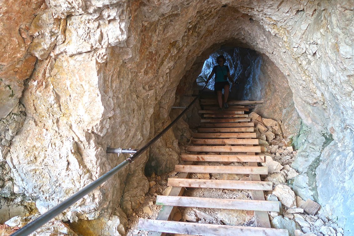 2. Seillänge (3, 20 m): In der Höhle gerade durch den Bogen hinauf, dann leicht rechts zu Platte (Bohrhaken), kurz aufwärts (Bohrhaken), dann auf Band (Bohrhaken) nach links zur Kante, Stand an Bohrhaken.