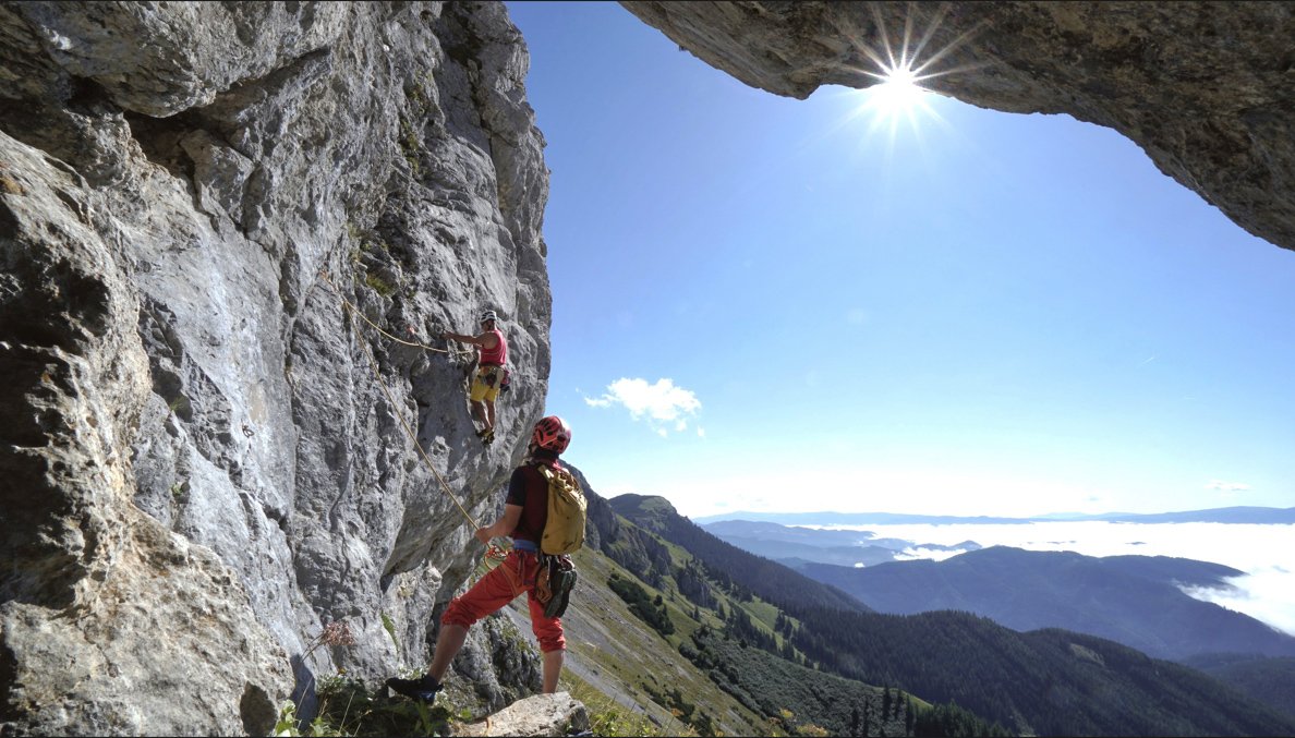 Alpin und eindrucksvoll, top gesichert und dennoch leicht würzig und abenteuerlich. Mit diesen Attributen wird versucht die Kletterei neutral zu beschreiben. Die hoch über dem, bei Wanderern überaus beliebten „Panoramaweg“ verlaufende Route ist abwechslungsreich und trotz der sehr guten Absicherung fordernd. Wer es bis zum Ausstieg auf der wunderschönen Blumenwiese am Plateaurand schafft, hat nicht nur über 300 Klettermeter und mehr als 10 gefinkelte Seillängen, sowie eine kurze Abseilfahrt hinter sich, sondern darüber hinaus mit Sicherheit auch spannende Momente in einer bislang völlig unbekannten und unberührten Wandflucht erlebt. Es hat seinen Grund, warum bislang nichts über lange Routen hoch über der Brunnalm, auf der Südseite der Hohen Veitsch, bekannt war! Eine durchgängige frei kletterbare Linie in einigermaßen akzeptablem Felsen zu finden, und das noch dazu gepaart mit möglichst homogenen Schwierigkeiten glich einer Quadratur des Kreises.