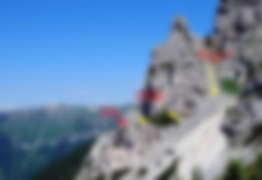 Abstieg: Jenseits den schmalen Gipfelgrat ein paar Schritte abwärts bis zu einem etwa 5m hohen Abbruch. Entweder abklettern (2) oder abseilen. In der darauffolgenden Geröllschlucht abwärts und rechts um den Bergkörper herum zurück zum Einstieg. Oder (empfehlenswert) Abstieg durch die Jahnschlucht (2), die zwischen Paulaturm und dem östlich vorgelagerten Jahnturm schmal hindurchführt zurück zum Einstieg.