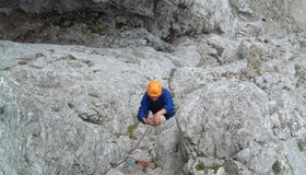 Schöne und sehr beliebte Tour. Sie durchquert die Westwand an ihrer leichtesten Stelle und bietet durchwegs anregende Kletterei in gutem Fels.