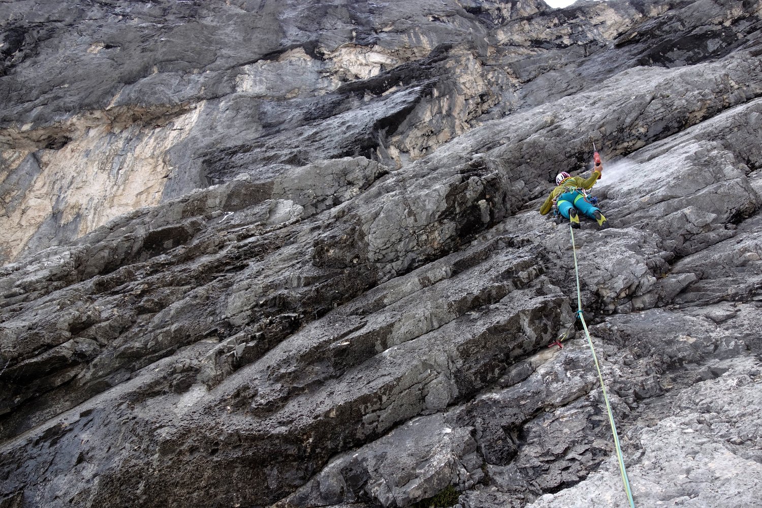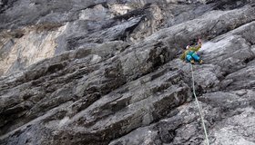 Die einfachste und längste Möglichkeit diese Wand zu durchsteigen erinnert bei der Felsqualität und Linienführung im unteren Teil an Grill-Routen am Gardasee. Nur ohne mediterranes Gestrüpp. Durch einige nachträglich gesetzte Haken sollte auch der alpin versierte Sportkletterer ohne andauernd zu betreibende Risikoanalyse Spaß haben können. Der obere Teil ab dem Wandbuch ist etwas alpiner mit etwas großzügiger Linienführung in manchmal auch brüchigem 3er Gelände, soll im Anspruch aber ähnlich bleiben.