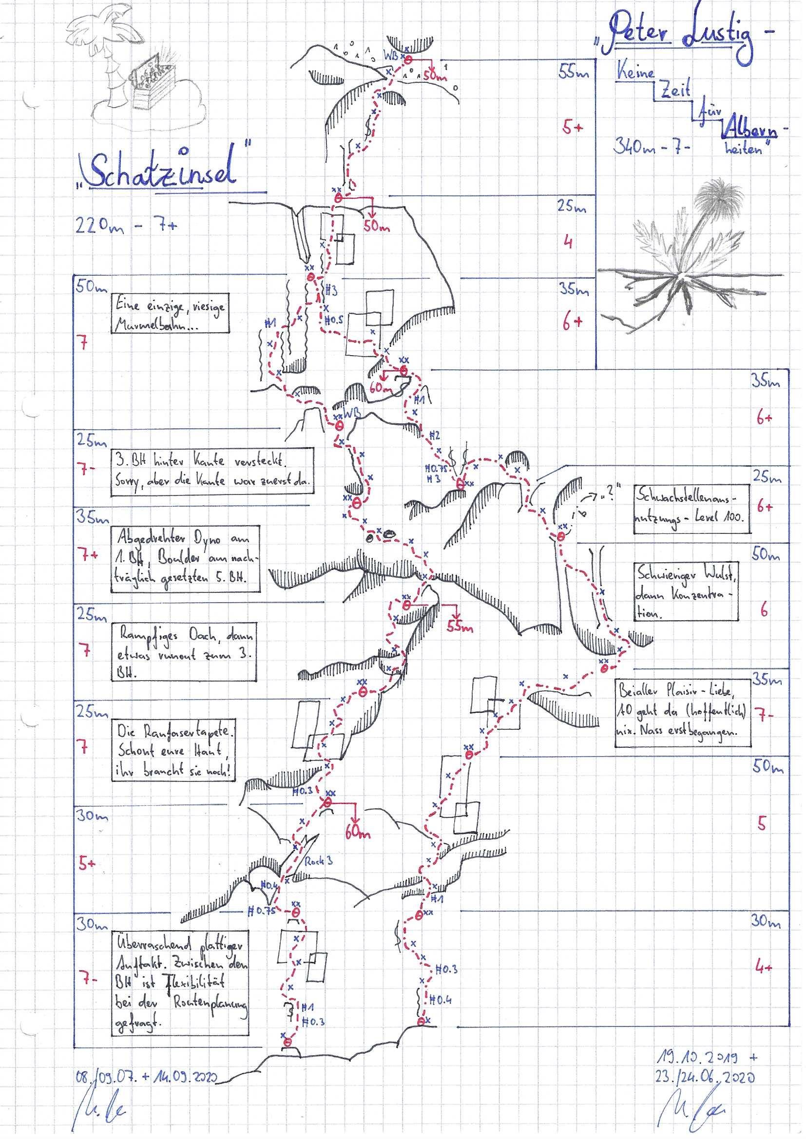 7- (in einer Seillänge), häufig im 6. Grad, im oberen Teil über längere Strecken auch im 2. und 3. Grad (6+ obligatorisch).