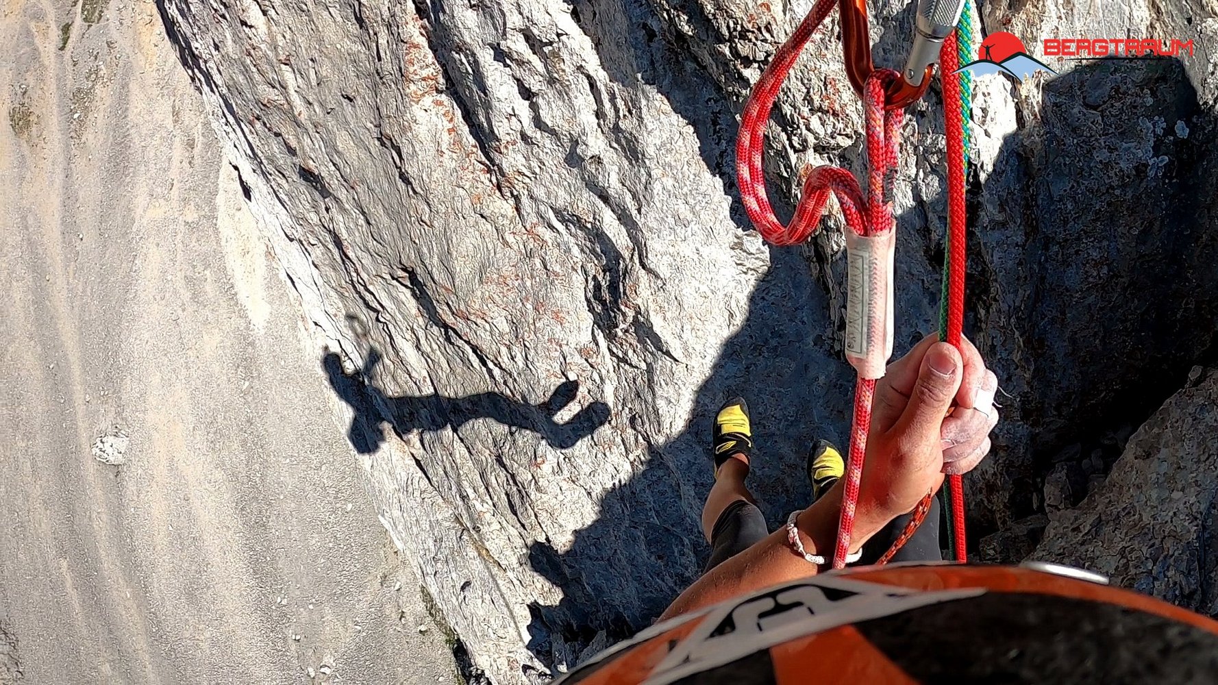 Abseilen: Vom letzten Stand zuerst 30 m orografisch leicht links hinunter. Dann in weiteren drei Längen (2x50 m, 1x 40 m) bis zum Einstieg (alle Abseiler sehr steil oder leicht überhängend). Vom Gipfel: Unmittelbar unter den Gipfelkreuz Abseilstand und 25 m runter. Absteigen zu Scharte, weiter abklettern rund 50 m bis zum nächsten Abseiler (orografisch rechts, grosser Bergrettungs- bolt). Wiederum 25 m abseilen, dann abklettern bis zu nächstem Stand (orografisch rechts, mehrere bolts). 25 m abseilen bis zu Schlingenstand (orografisch links). Von da runter bis ins Schotterkar.