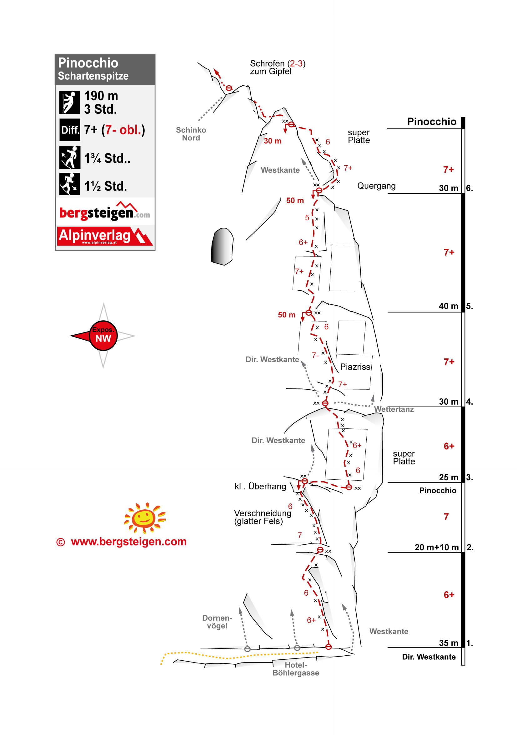 Pinocchio ist eine sehr gut abgesicherte Sportkletterroute im Nahbereich der Westkante der Schartenspitze. Super rauher Fels in unvergleichlicher Umgebung. Die ersten beiden Seillängen folgen der „Direkten Westkante“: