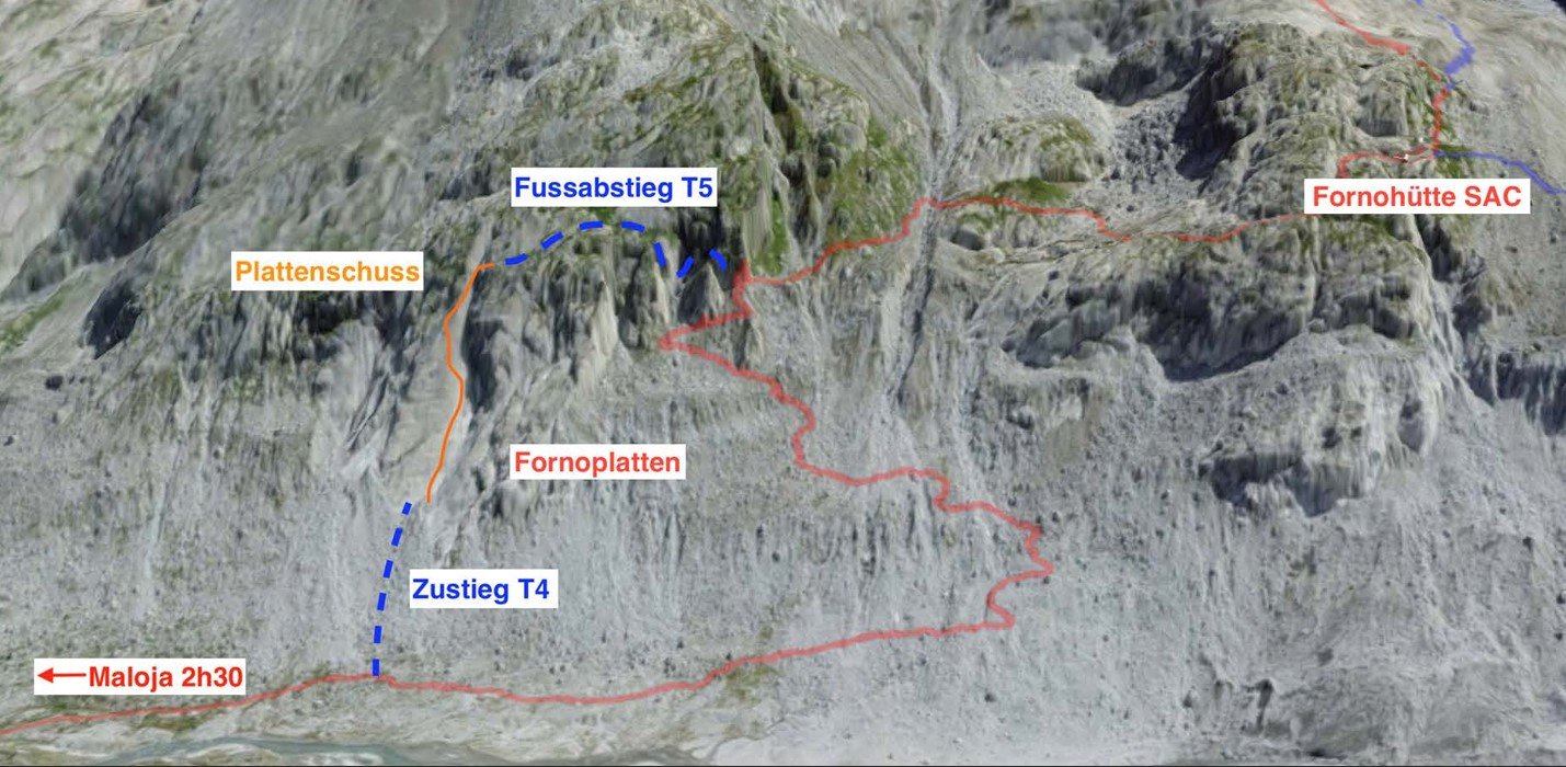 Von der Fornohütte über markierten Wanderweg Richtung Maloja ins Val Forno absteigen. Die markanten Fornoplatten befinden sich nun rechts und werden durch steiles Blockgelände (Steinmännchen) erreicht. Einstieg 5 m rechts vom tiefsten Punkt der großen Platte (ca. 1h ab Fornohütte). Vom Maloja ca. 3,5 Stunden über den Zustiegsweg zur Fornohütte.