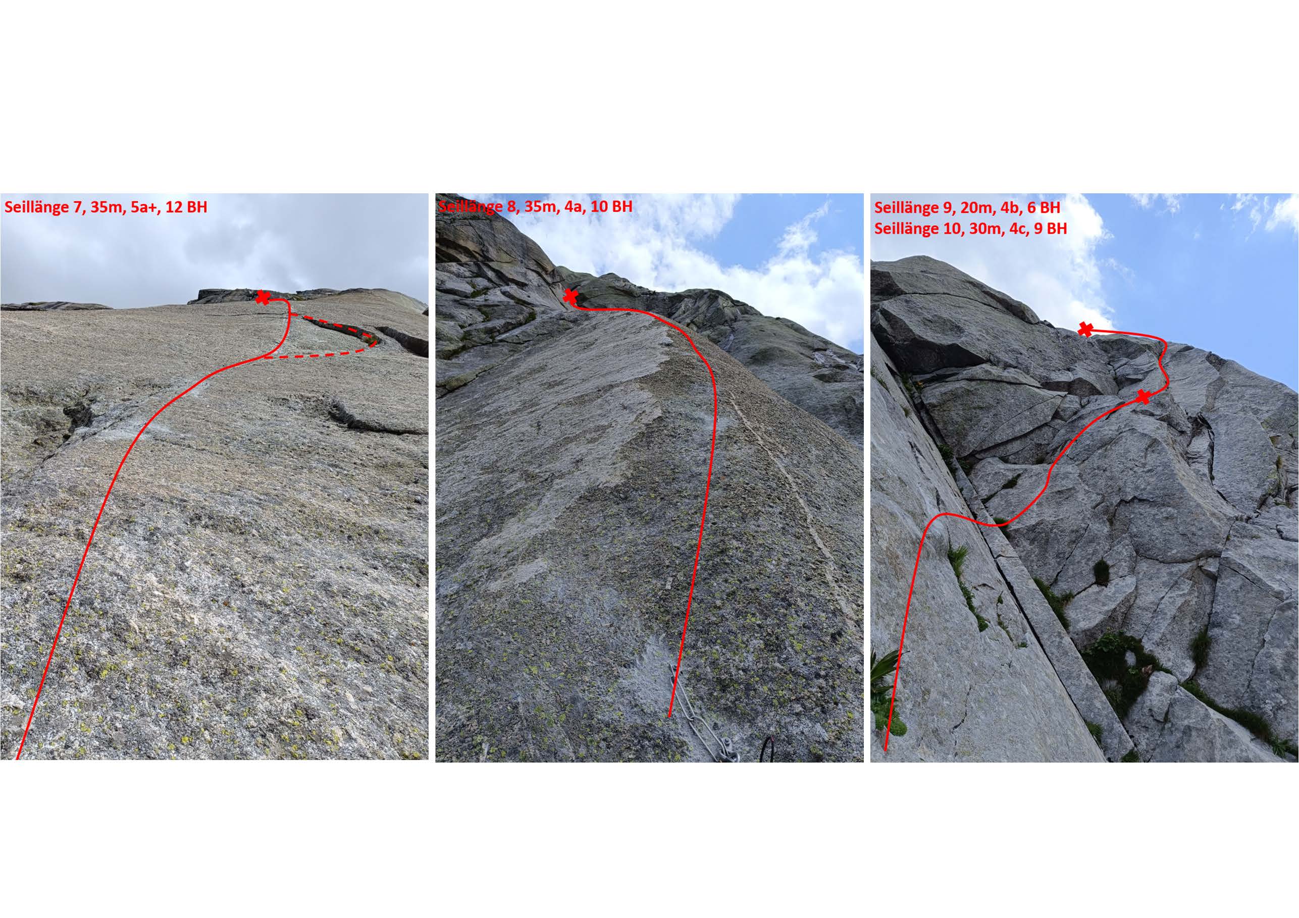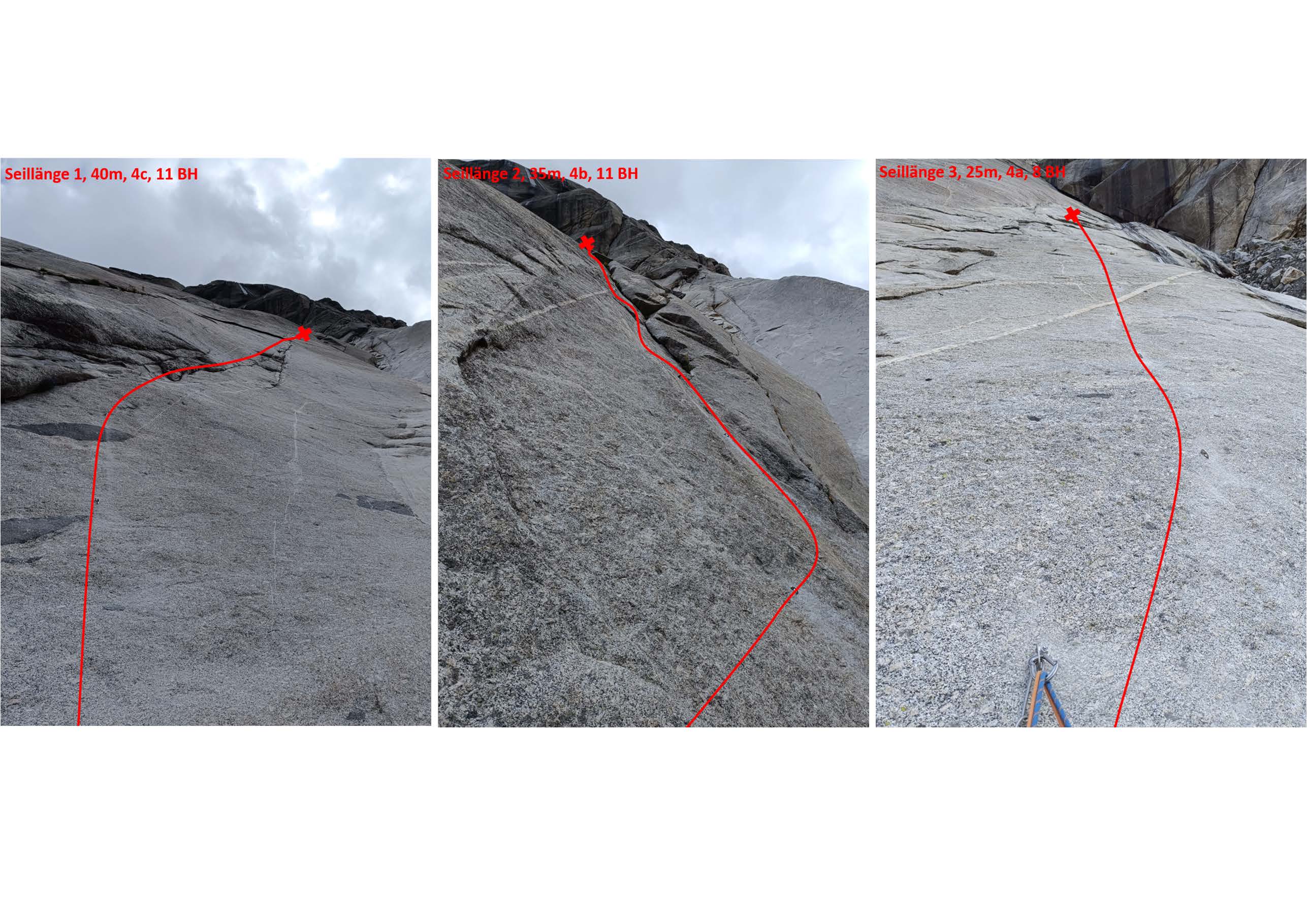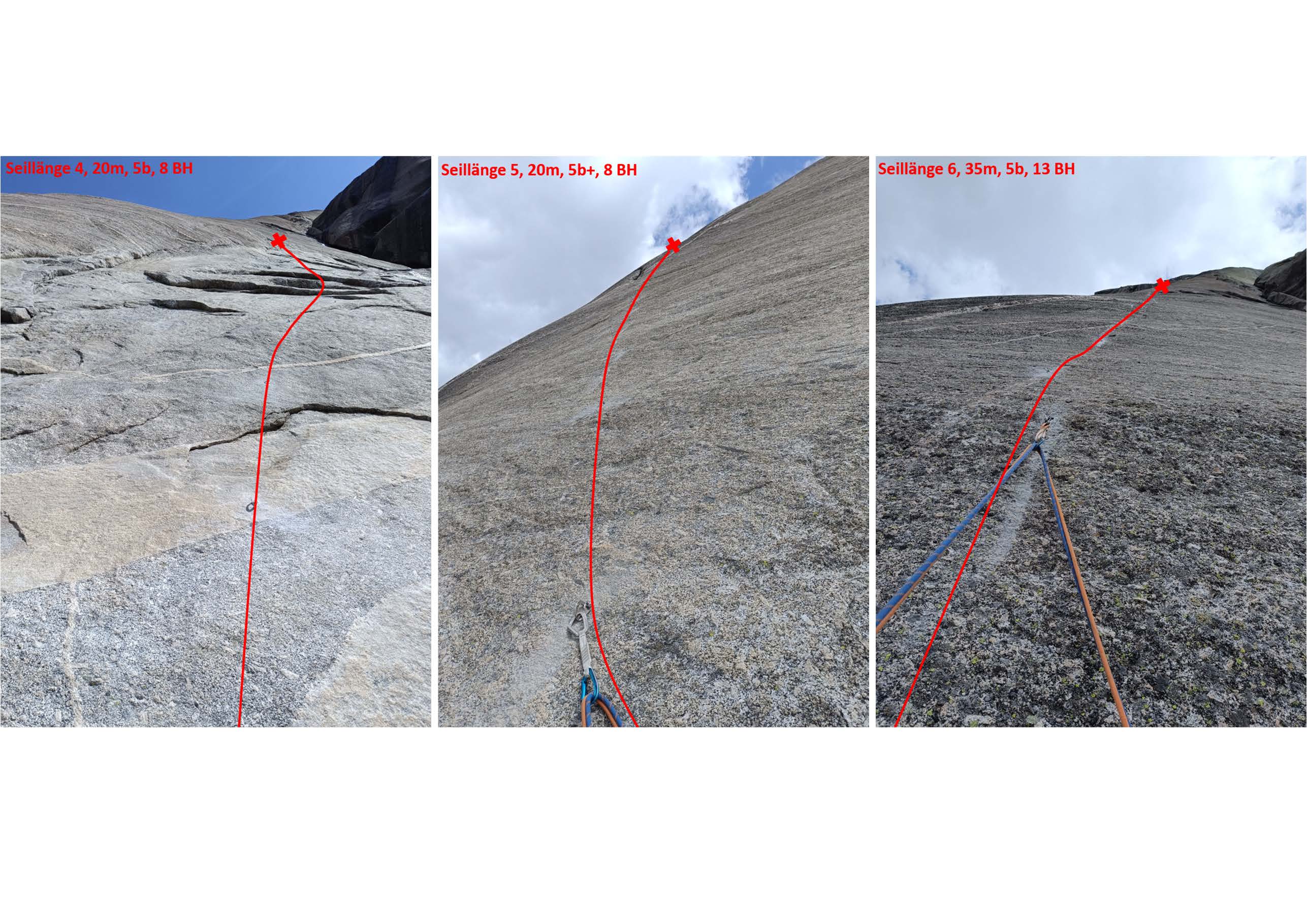 Eine lange in Vergessenheit geratene Linie, im Juli 2025 modern saniert und nun wieder lohnend begehbar. Die Plattenschuss folgt einer logischen Linie über Kristalladern, Verschneidungen, Reibungsplatten und feine Leisten – durchgehend abwechslungsreich und stimmig. Die durchgehend gute Absicherung macht die Plattenschuss auch für weniger Erfahrene gut machbar – und erlaubt das Panorama über Gletscher und Fornotal zu genießen. Die Platten trocknen auch nach starkem Regen sehr schnell und die Tour ist innerhalb weniger Stunden wieder kletterbar.