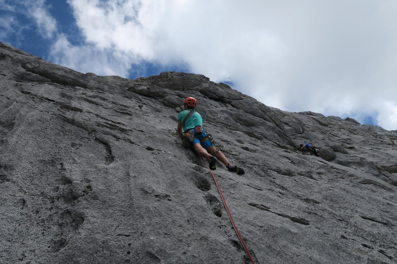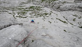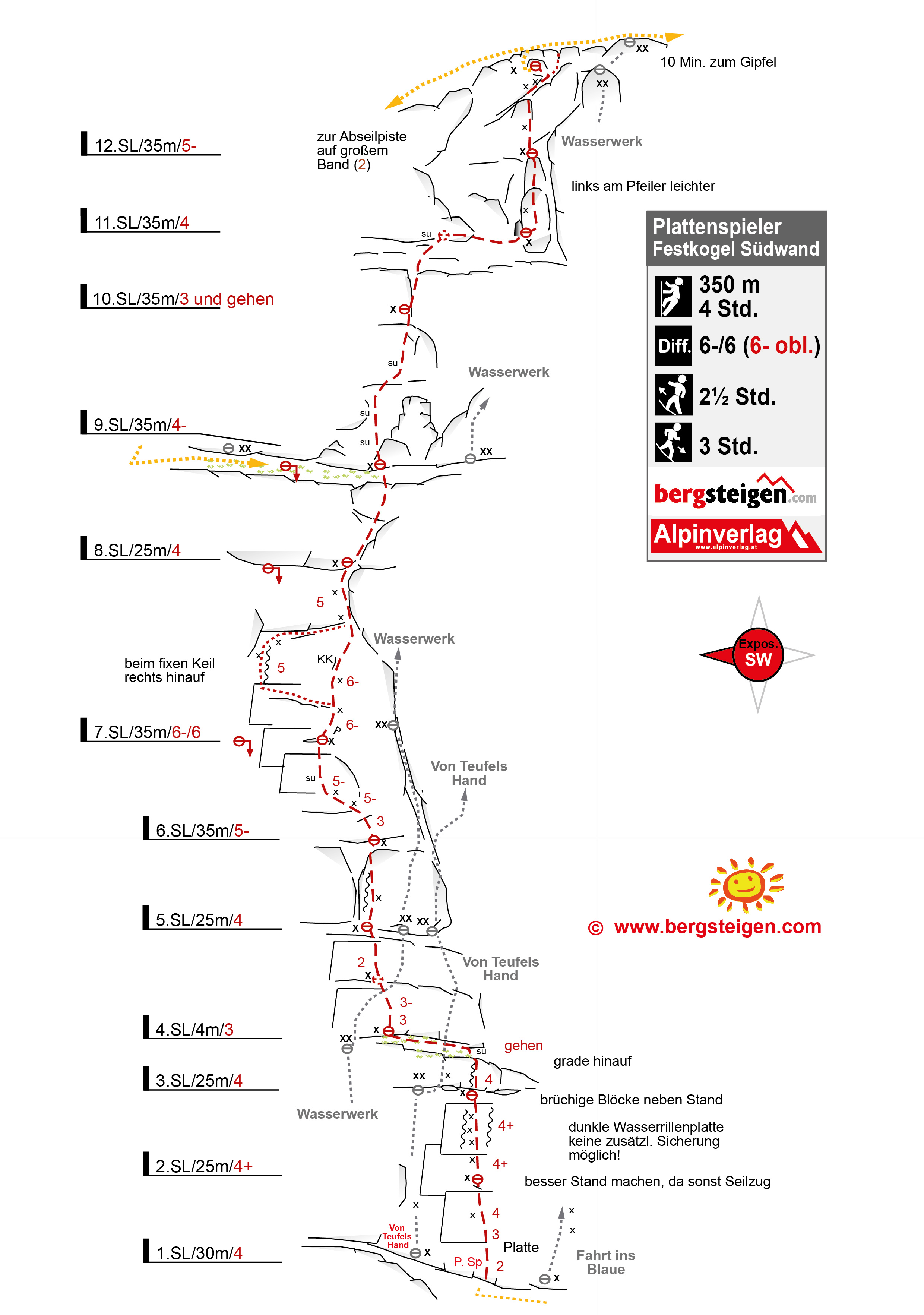 Sehr schöne Route im der tollen Plattenwand des Festkogels im Nationalpark Gesäuse. Die Tour geht zwischen den Routen Von Teufels Hand und Fahrt ins Blaue hinauf und bietet durchswegs sehr gute Kletterei im überwiegend 5ten Grad, den man aufgrund der wenigen Bohrhaken aber ganz sicher klettern sollte, da eine zusätzliche Absicherung mit Keilen und Friends in der Plattenwand oft schwierig ist. Die Bolts sind nach der Sanierung aber in gutem Zustand und die Kletterei sucht hinsichtlich Schönheit ihresgleichen.