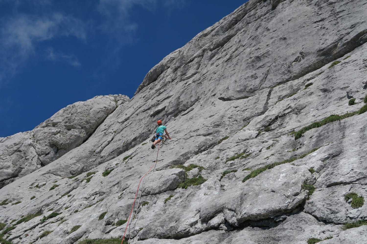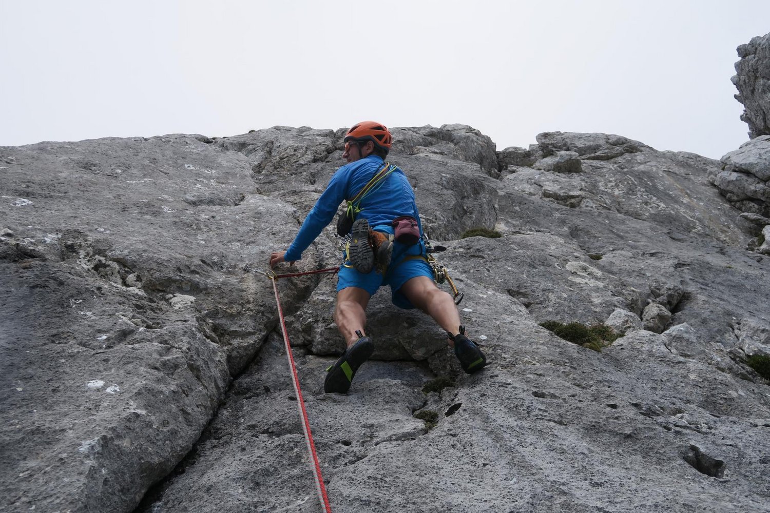 Die Tour ist an den wichtigen Stellen stets mit Bohrhaken abgesichert, dazwischen muss man aber oft zwingend weit klettern.