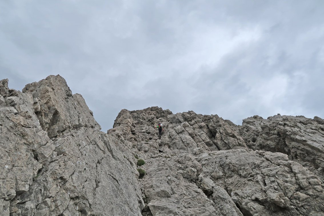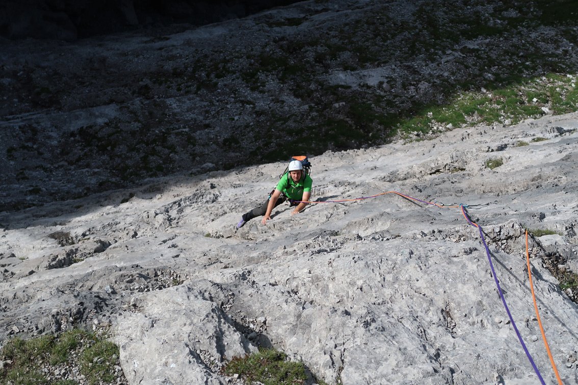 Die Tour ist für eine Mehrseillängentour sehr gut gesichert. Aber Achtung: Am Ende muss man noch ca. 150 Hm auf dem Gipfelgrat bis zum höchsten Punkt klettern - der Grat ist leicht (meist um 1-2 und Gehgelände). Die Tour ist also nicht wirklich was für Plaisirkletterer ohne Schrofenerfahrung.