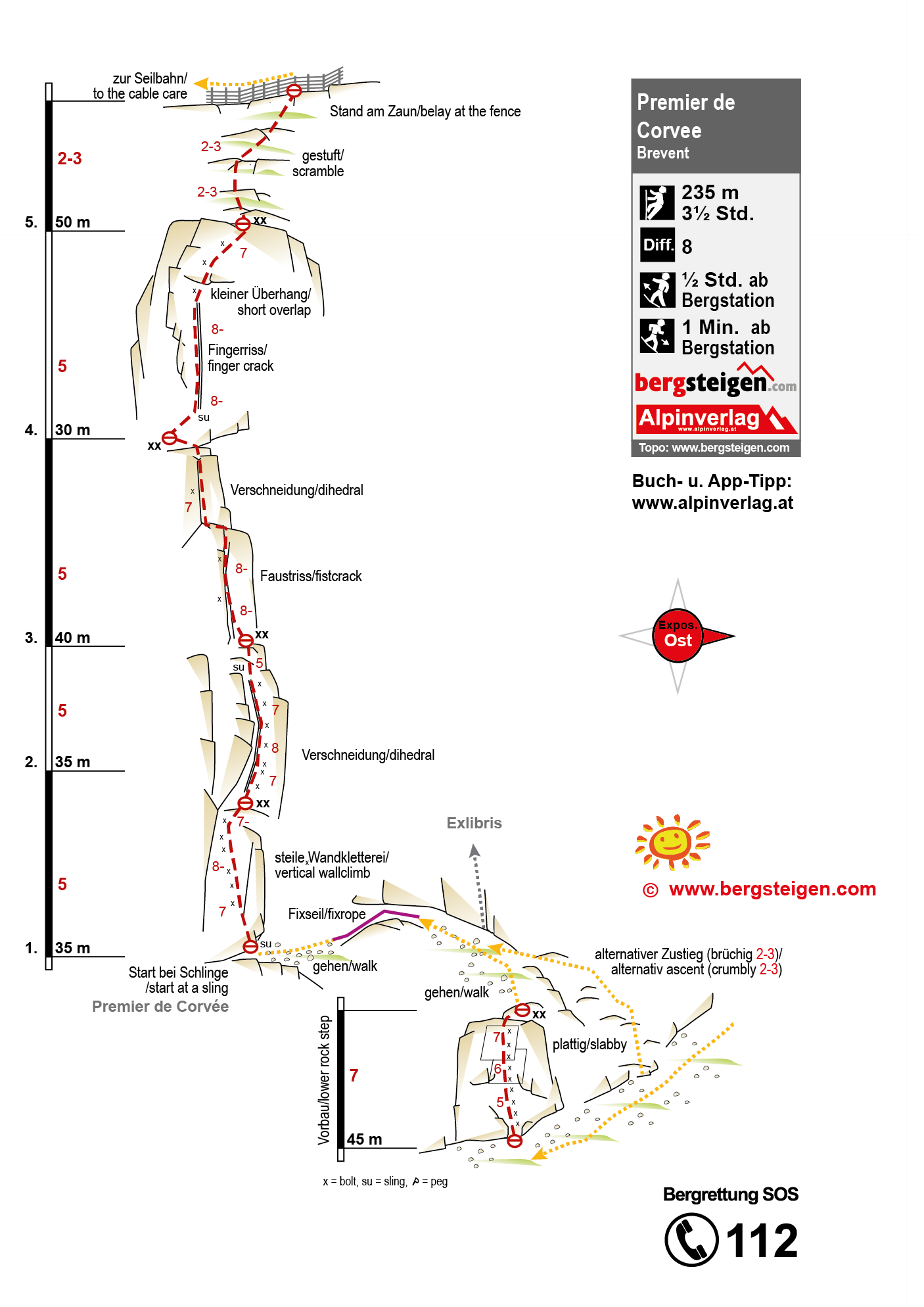 Die Premier de Corvée ist eine schwere, fantastische Risskletterei in der Ostwand von Brevent! Das Highlight der Route ist sicher die Lange steile Verschneidung in der vorletzten Seillänge, die je nach Handgröße als Faustriss oder Offwidth geklettert werden muss, sowie der Fingerriss in der letzten Seillänge. Die Route ist teilweise gebohrt, da wo es sich anbietet (vor allem die letzte und vorletzte Länge) muss mit mobilen Sicherungsmitteln selbst abgesichert werden.