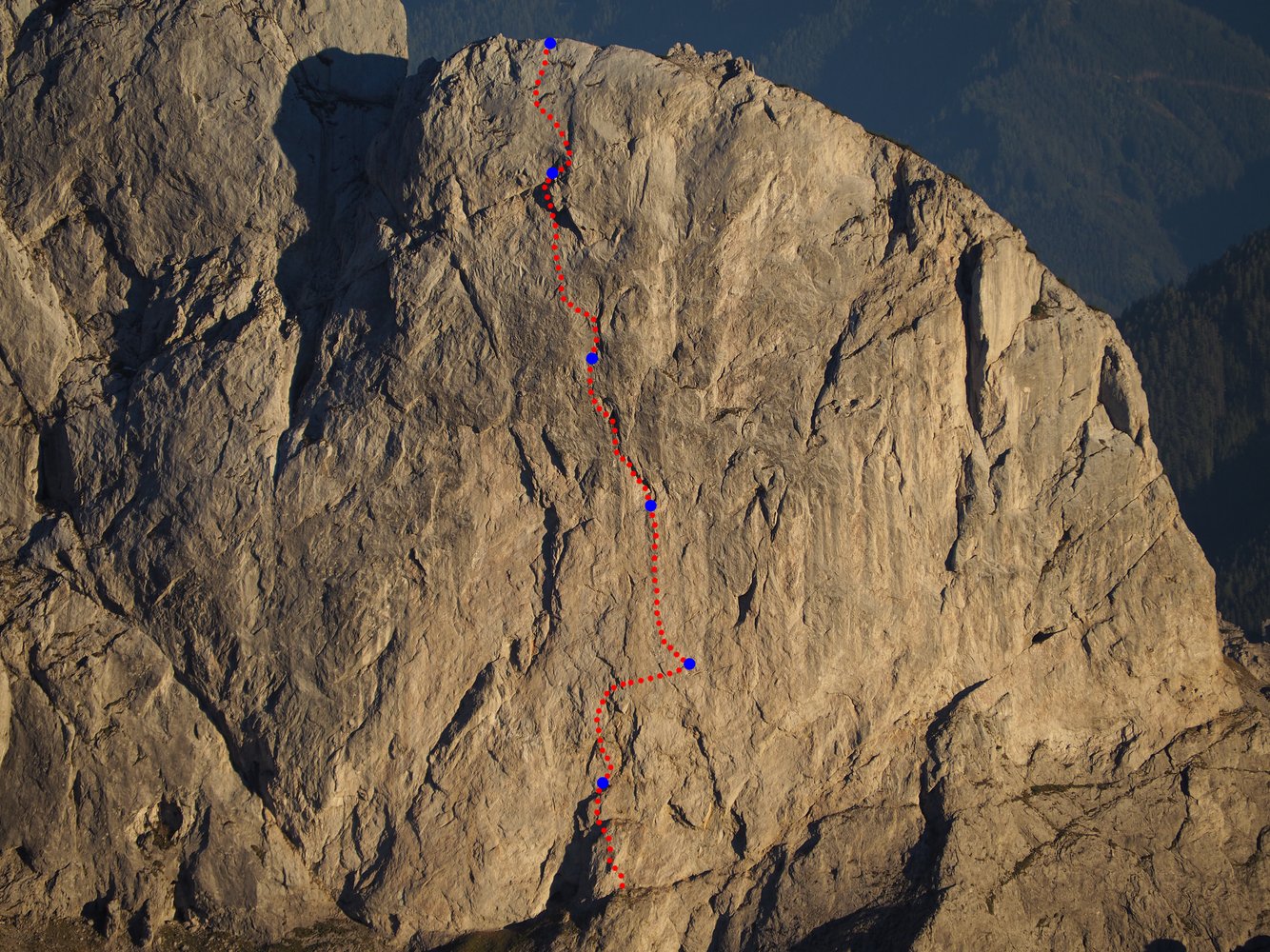 Der letzte Abseilstand (nach 2. SL) ist nicht der Stand, von dem aus die 3. SL geklettert wird, sondern 7 m links davon. Beim letzten Abseiler unbedingt anpendeln, um das grasige Schrofenband zu erreichen. Dann nach links zum Einstieg gehen und den/die Zweite/n zu sich ziehen.