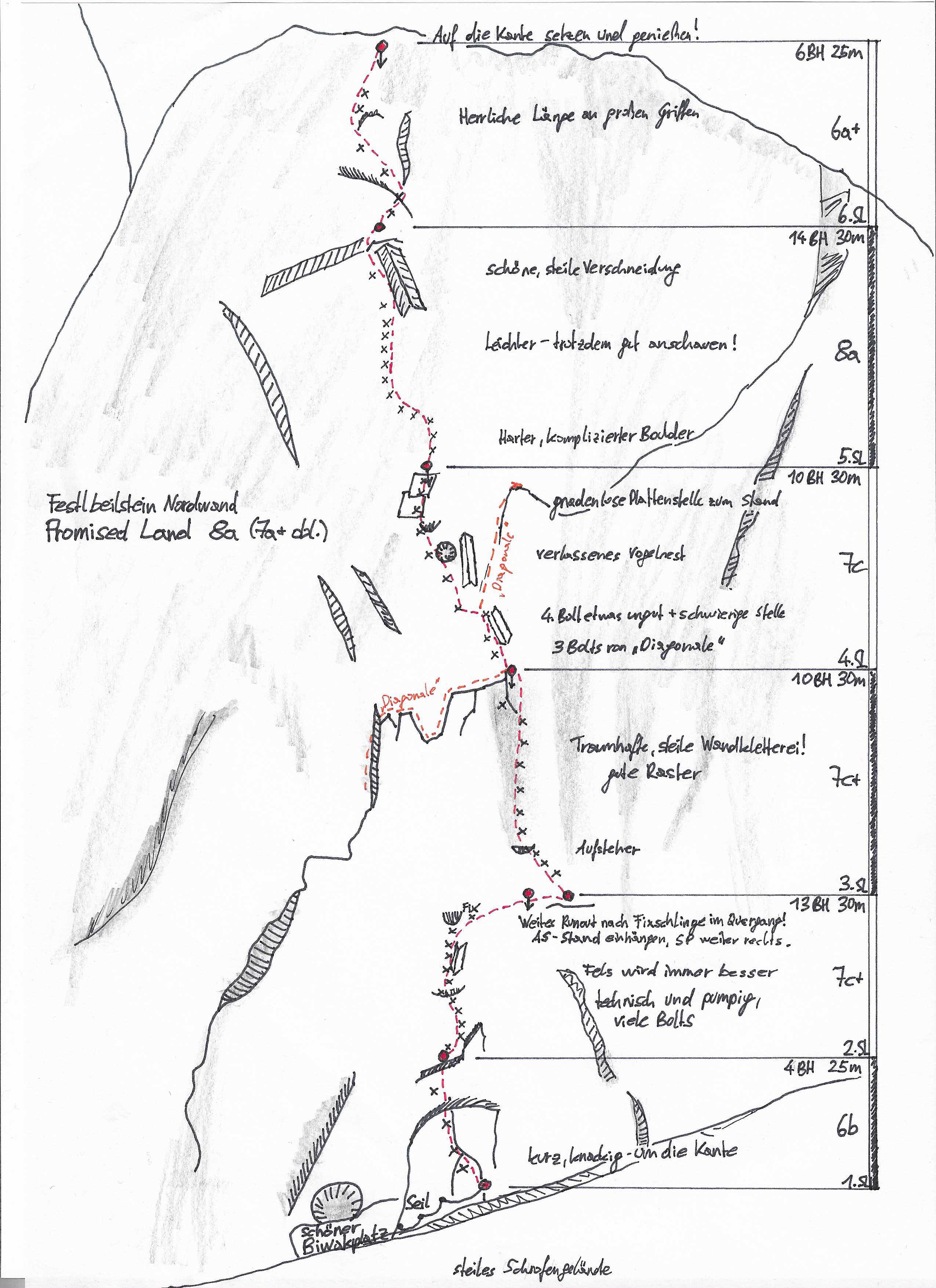 SL 4 7c: Die ersten 3 Haken wie bei der Diagonale. Dann ein weiterer Abstand nach links, schwer einzuhängen. (Gebohrt von Cliff auf Leiste, die Leiste gibt es leider nicht mehr) Leichter, etwas alpinerer Mittelteil. Zum Stand muss man die Platten-Skills auspacken!