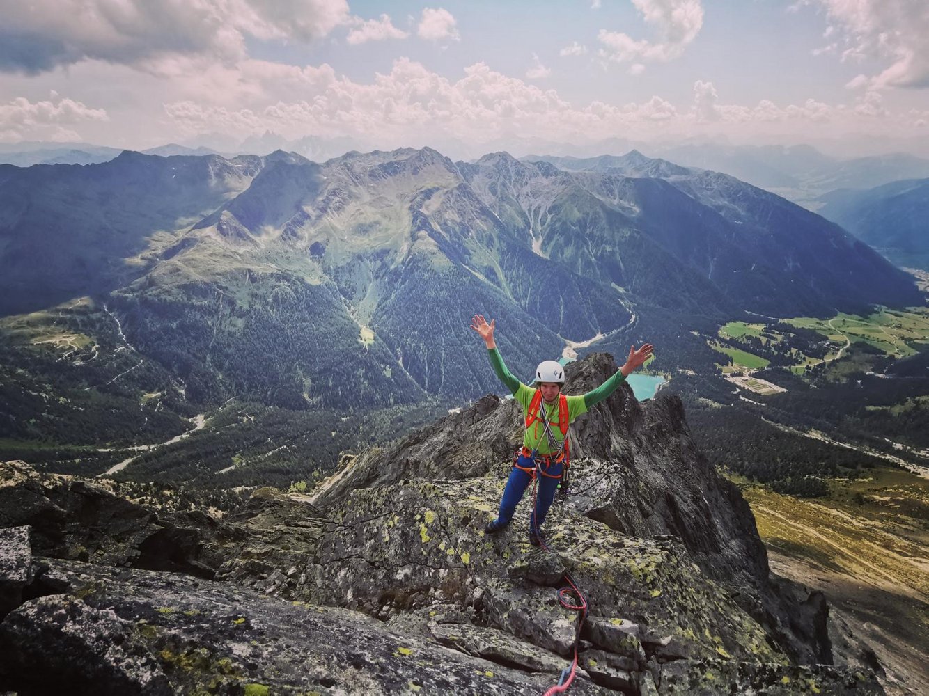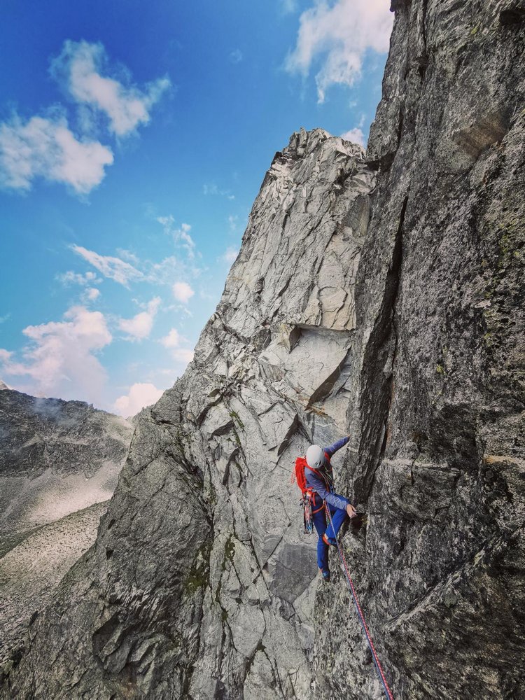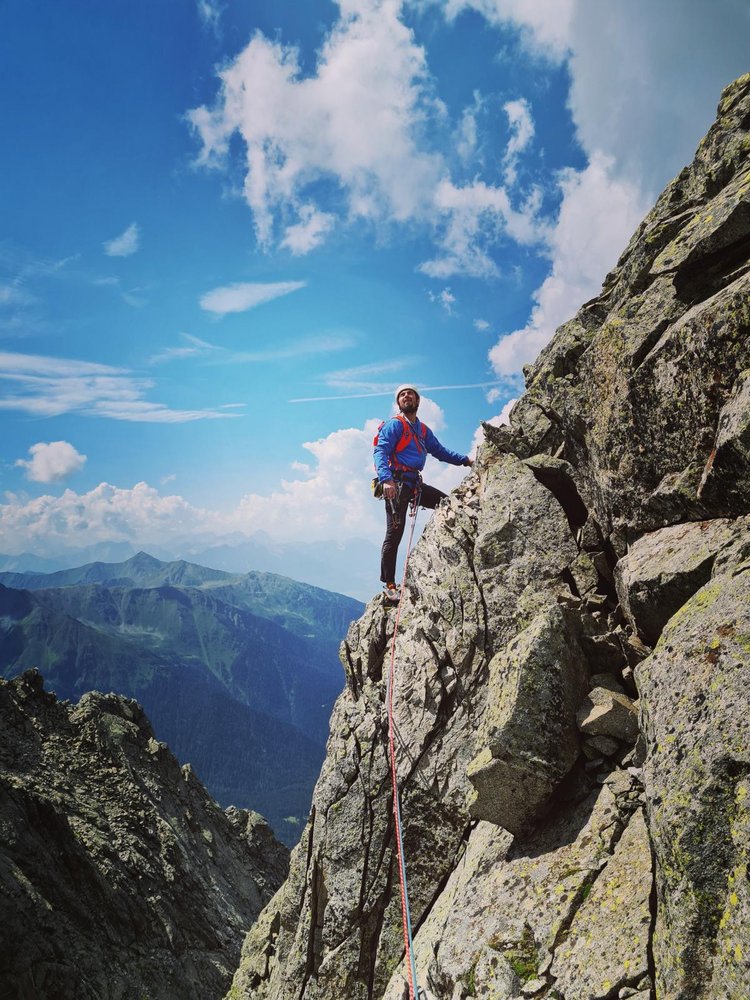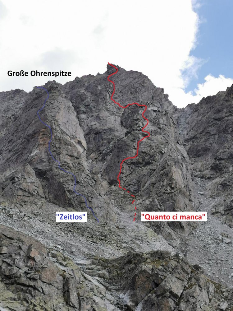 "Nachdem wir Anfang Juli bereits den ersten Pfeiler an der großen Ohrenspitze erklettern konnten, war natürlich das Interesse für die benachbarten Pfeiler und deren Möglichkeiten weitere Linien zu eröffnen, geweckt. Mitte August genau am sogenannten "Hoch unser Frauen-Tag" oder wie die Italiener sagen dem "Ferragosto" nahmen wir den langen und mühsamen Aufstieg zur großen Ohrenspitze ein weiteres Mal in Angriff. Ziel war es, am zweiten Pfeiler eine möglichst logische Linie mithilfe traditionellen Absicherungen zu erschließen. Die erste Seillänge entpuppte sich allerdings verwegener als vermutet. Dieser geschlossene Wandbereich bot kaum nennenswerte Möglichkeiten mobile Sicherungen anzubringen. Nach einer heiklen Rechtsquerung wurde der Felsen allerdings hinsichtlich Angebot an Rissen und Spalten wieder großzügiger. In einem unglaublich tollem alpinen Ambiente erkletterten wir schlussendlich nach neun abwechslungsreichen Seillängen einen vorgelagerten Tonalit-Sporn auf dem Südgrat. Dort richteten wir den ersten von drei Abseilständen ein und seilten uns in direkter Falllinie ab. Die "Quanto ci manca?", was so viel bedeutet, "wie weit ist es noch?", ist begeisterten gehtüchtigen alpinen Kletterern empfohlen, die das Klettern weit weg von viel befahrenen Passstraßen, touristisch überlaufenen Wanderwegen und viel frequentierten Modetouren schätzen. Die alpine Atmosphäre und die eindrucksvollen Ausblicke entlang der Route entschädigen sicherlich für den langen mühsamen Aufstieg. Ein "bergiger Genuss" für jene, die herbe Zustiege, heikles Klettern und alpines Flair hoch achten."