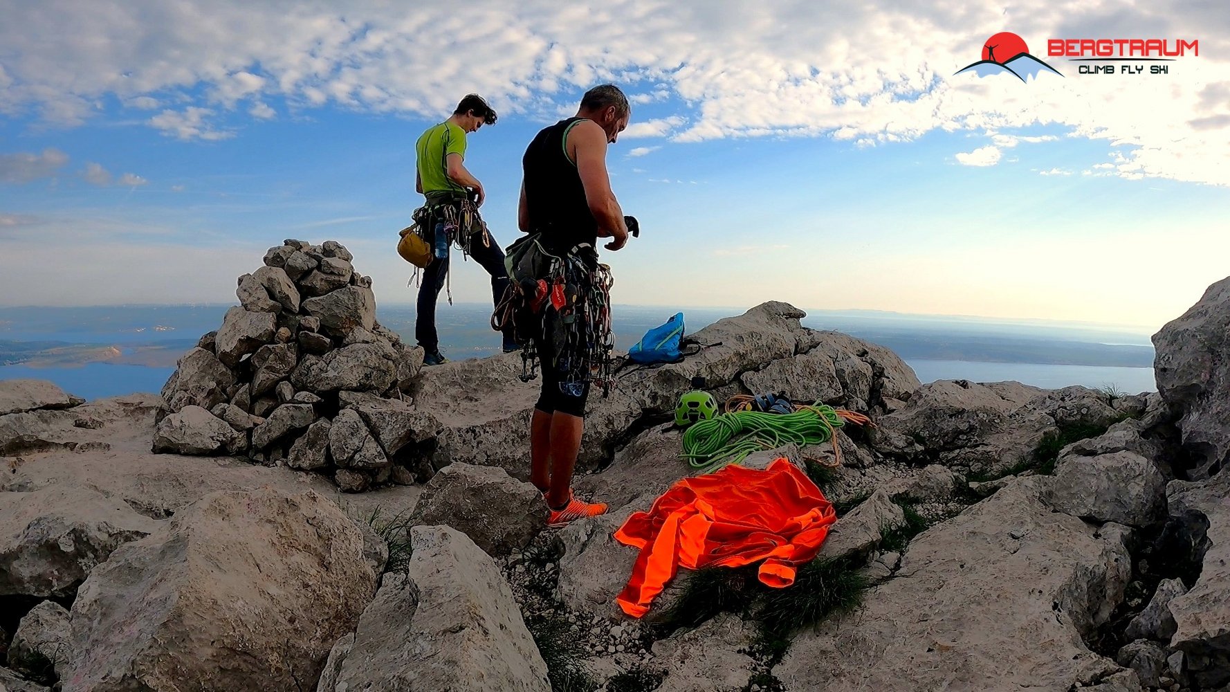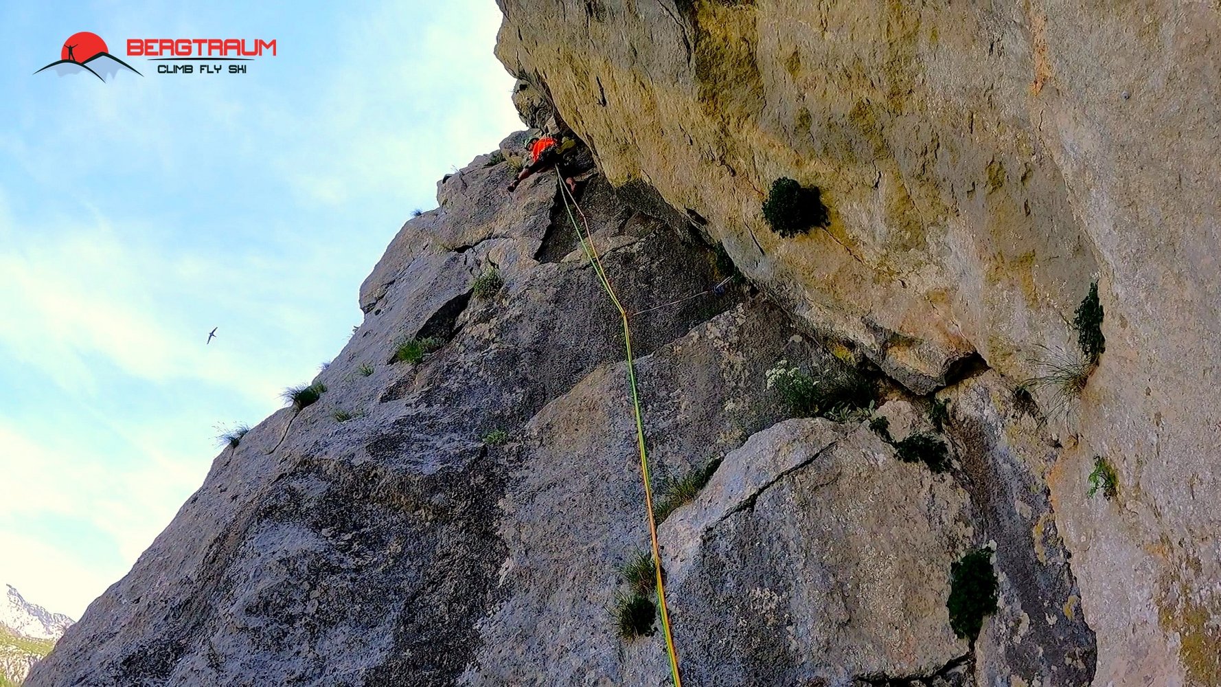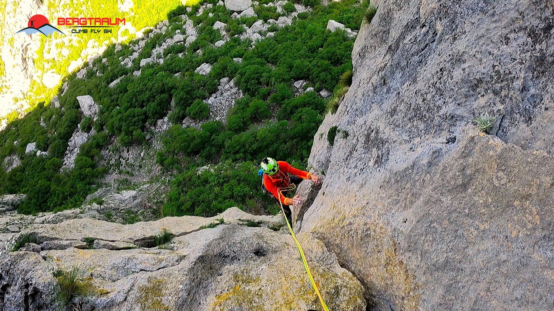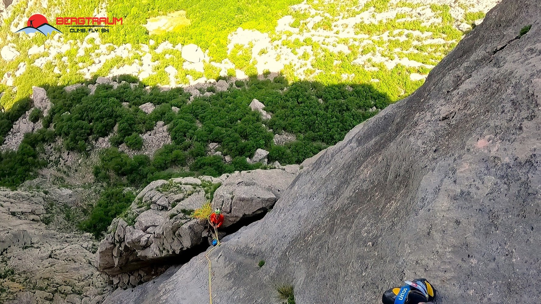 L3- 5a: Vom Stand nach links weg durch eine markante Verschneidung hinauf in leichteres Gelände und direkt auf den markanten Zapfen zu Stand gemeinsam mit der Velebitaski.