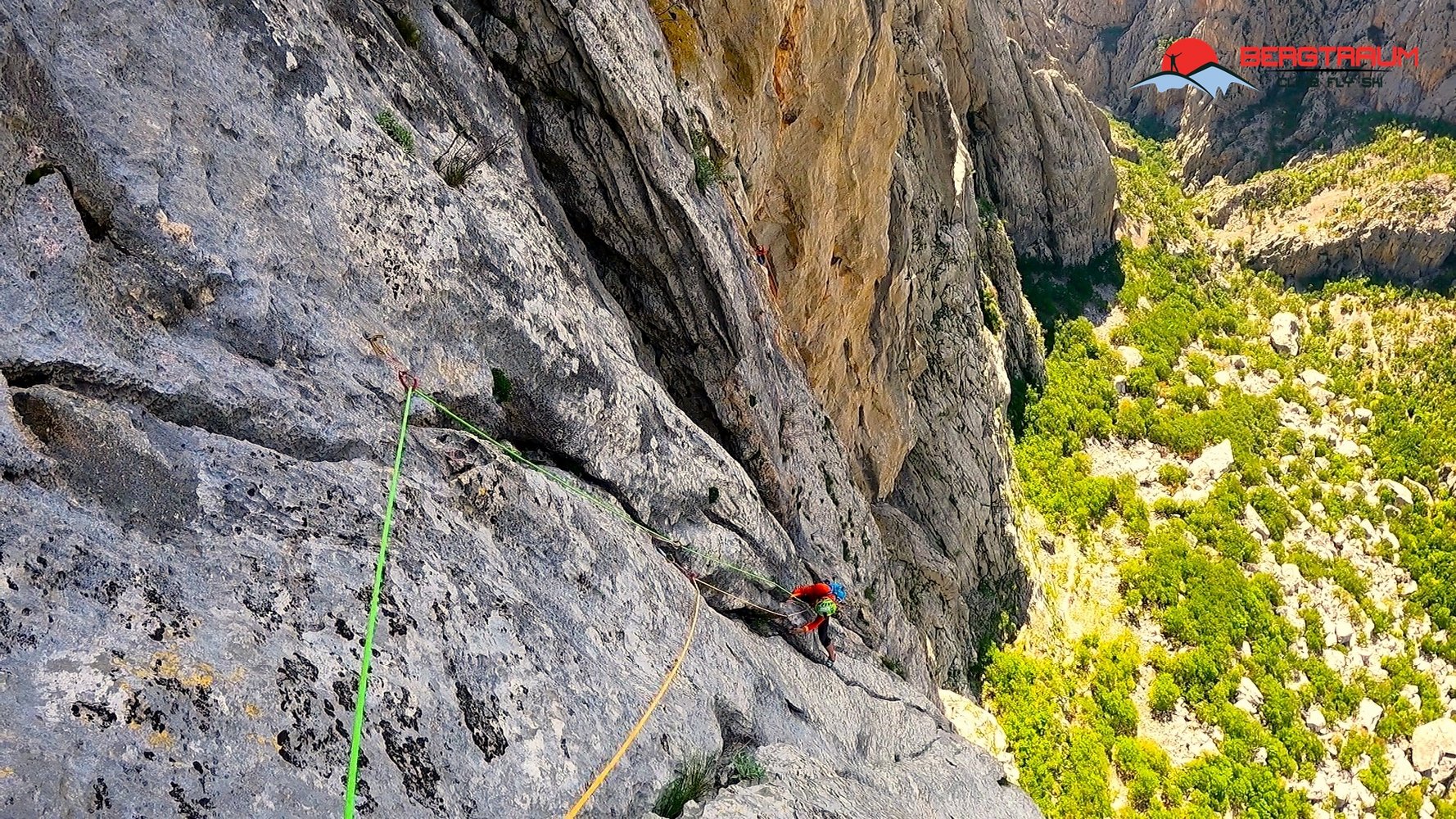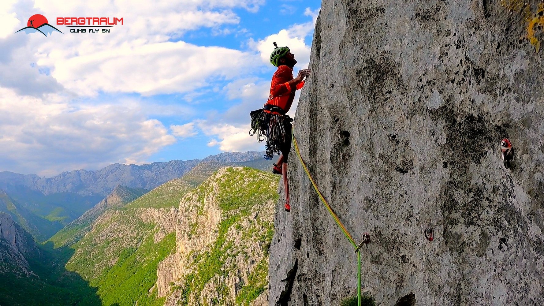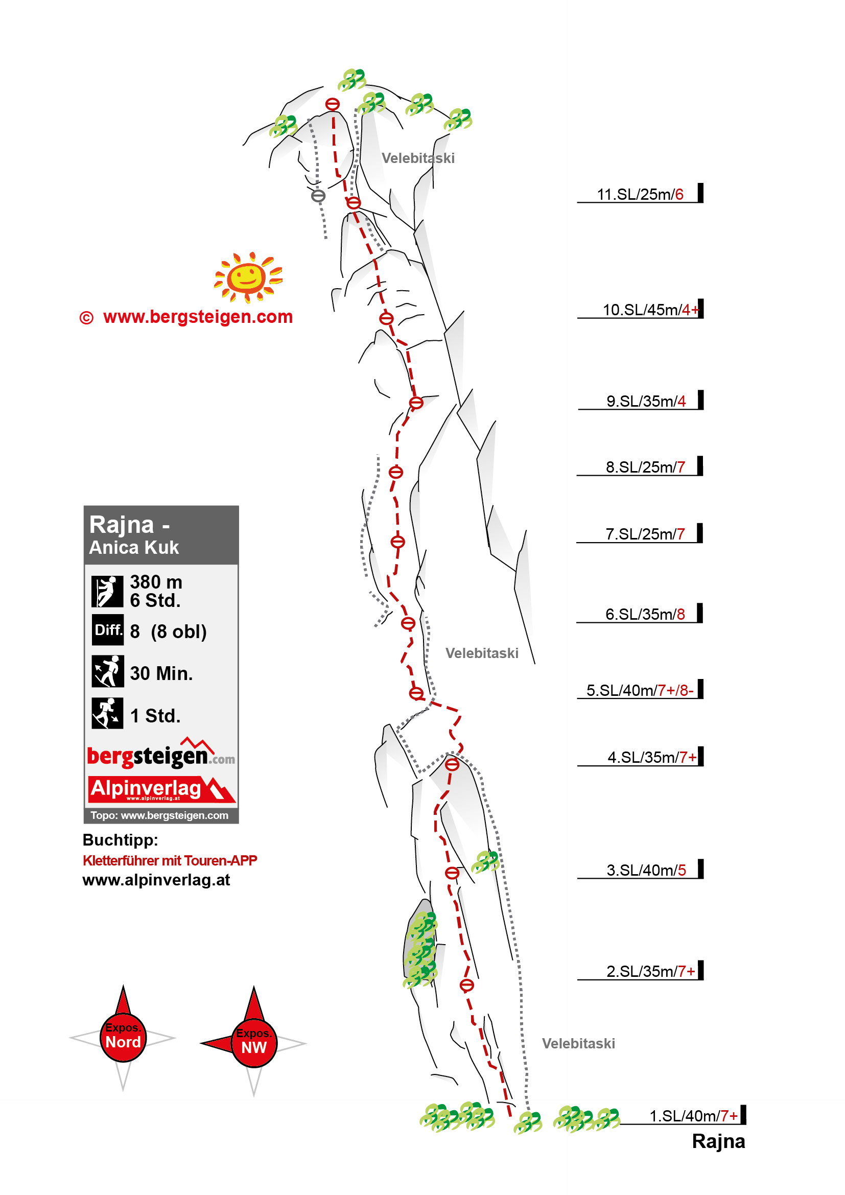 Eine anspruchsvolle Linie im Sektor Trapez des Anica Kuk. Die Tour ist Remy- typisch schwer und technisch. Es stecken wenige Bohrhaken, dazwischen ist selbst für die Absicherung zu sorgen. Die SL 7 und 8 können auch zusammengehängt werden.