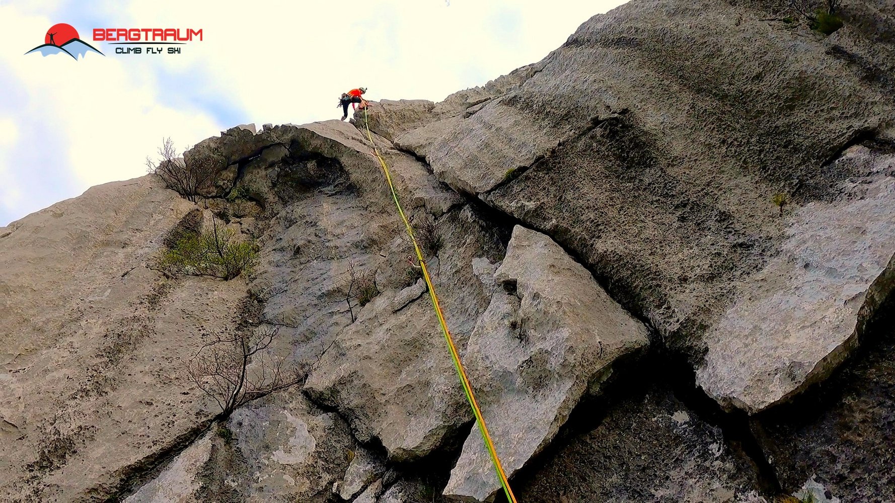L7- 6b: gerade hinauf zu (Zwischen-) Stand. L8- 6b: Schöner, messerscharfer Fels mit einigen Untergriffen rechts ansteigend hinauf.