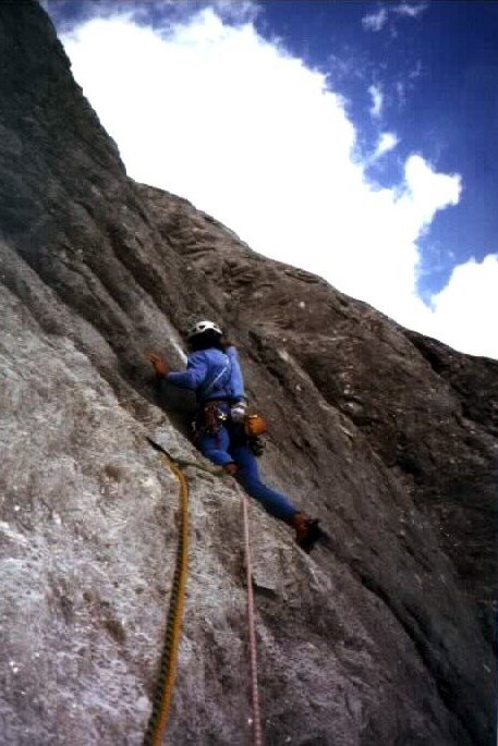Lange im unteren Teil steile Wandkletterei in besten Fels, dann herrliche Plattenkletterei, fast ausschließlich an genussvollen Wasserrillen.
