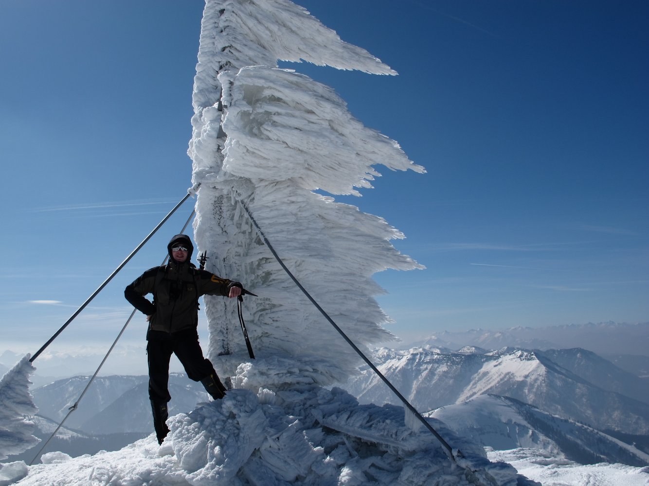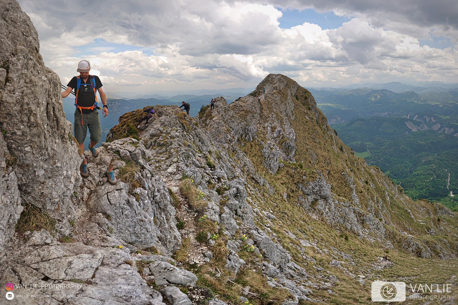 Der Rauhe Kamm auf den Oetscher gehoert sicher zu den schoensten Gratanstiegen die das Land Niederoesterreich zu bieten hat. Der Berg mit seiner auffaelligen Erscheinung ist von vielen Gipfeln in Noe. sichtbar und stellt ein lohnendes Ziel dar. Der Oetscher ist sowohl im Sommer fuer den geuebten Bergwanderer bzw. Kletterer (der Rauhe Kamm ist 1+, mit moeglicher Direktvariante 2) Anziehungspunkt, als auch im Winter ein lohnendes Skiziel. Der Rauhe Kamm wird im Winter zum Abenteuer (siehe Foto) und kann bei hoher Schneelage zu einer ernsten Sache werden! Die Tour verlaeuft immer am Kamm, der von Nordosten nach Suedwesten zum Gipfel zieht. Die Route ist bei sicheren Verhaeltnissen auch mit Ski (meist aber am Buckel) zu empfehlen.