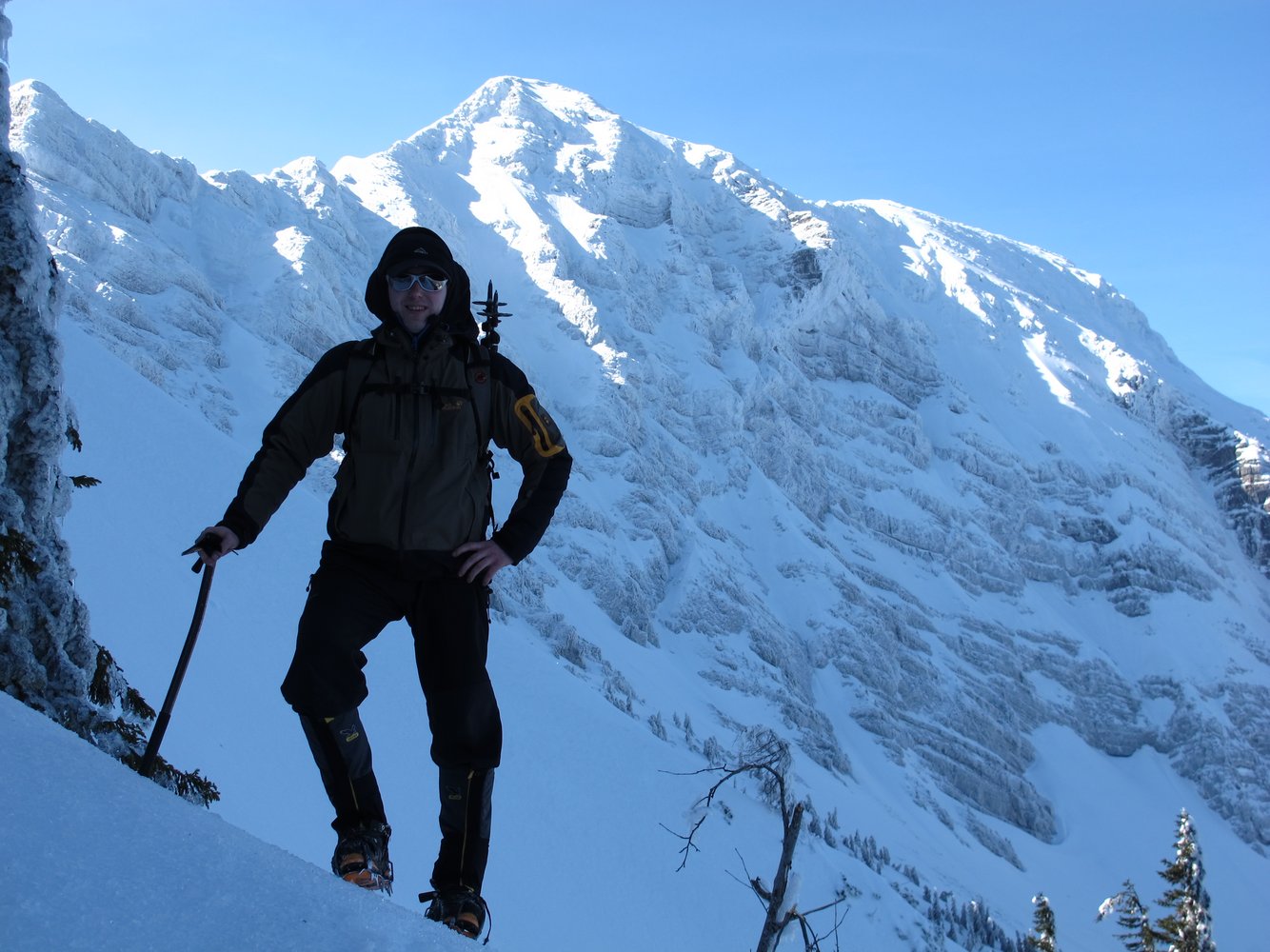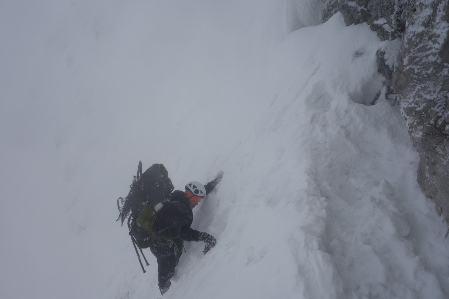Für Ungeübte und im Winter: Einfachseil, 2 Express- und Bandschlingen, bei Vereisung Steigeisen und Pickel.