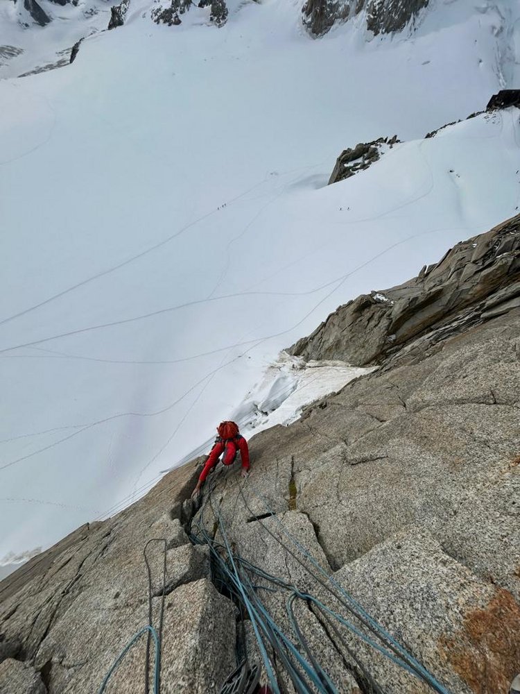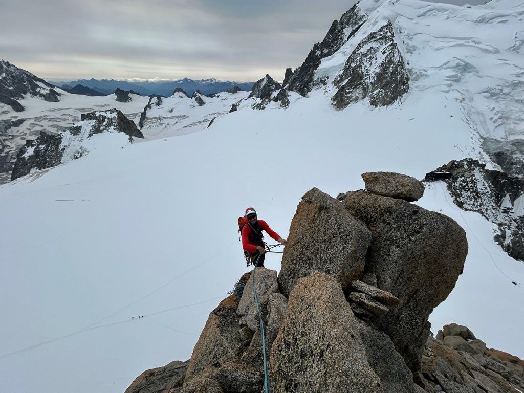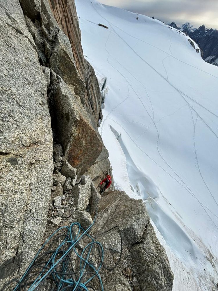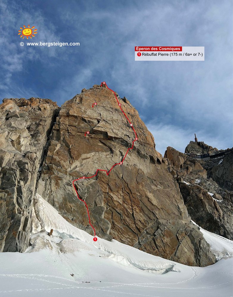 Kurze schöne Tour am Éperon des Cosmiques. Die Tour ist perfekt für einen halben Tag, oder in Kombination mit einer anderen Tour am Èperon des Cosmiques oder Midi - Südwand. Die Tour hat eine kurze 6a+ Schlüsselstelle und ist super um sich an den Mont Blanc Granit zu gewöhnen und akklimatisieren.