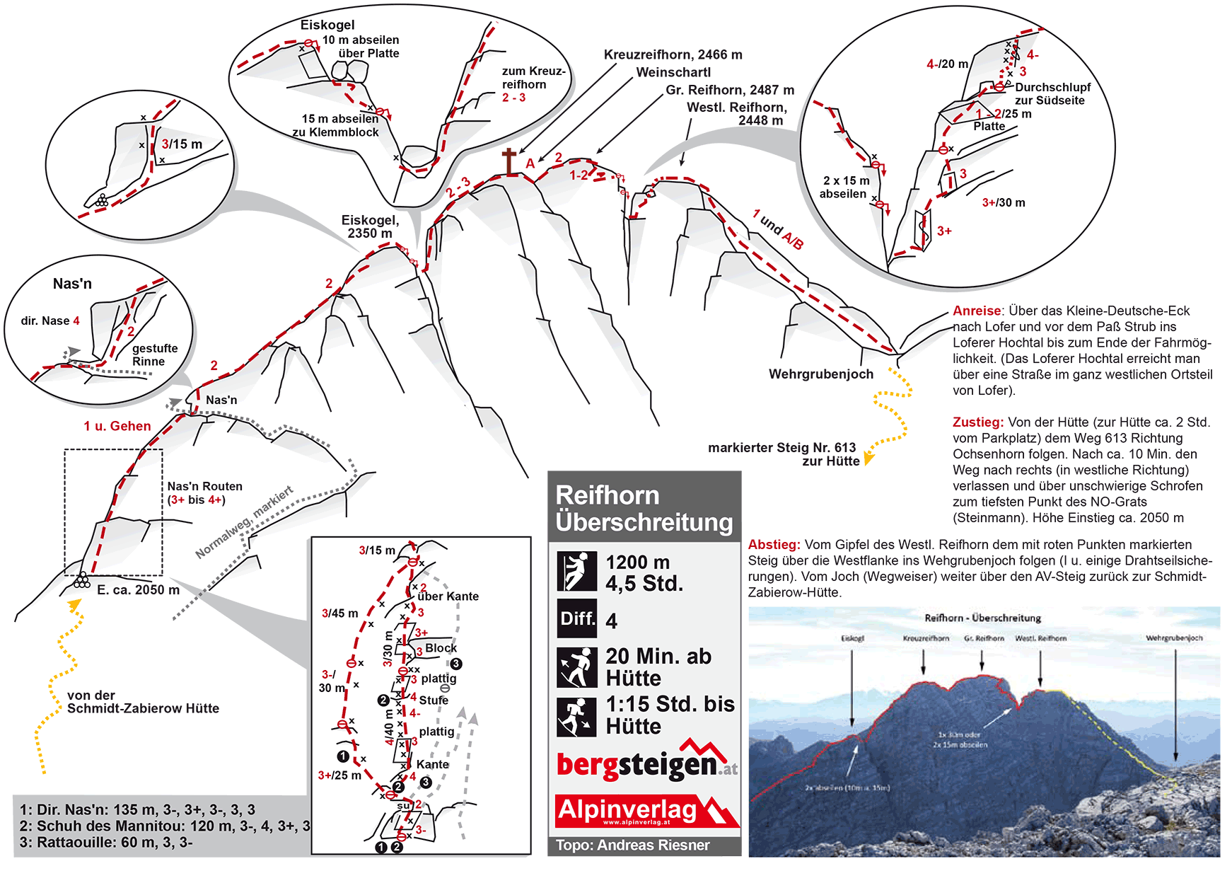 Siehe Topo. Vom Einstieg am Fußpunkt des NO-Grats über eine der beiden Routen "Dir. Nas´n" oder "Schuh des Manitou" in 3 bzw. 4 Seillängen in leichteres Gelände. Nach ca. 100 m Gehgelände erreicht man die sogenannte Nas´n, wo man den Normalweg kreuzt. Über eine Rinne (II) an der in Aufstiegsrichtung rechten Seite der Nase erreicht man wieder den Grat (Nase direkt IV). Weiter am wieder leichteren Grat. Eine markante Steilstufe wird wieder rechts (nordseitig, Steinmann) durch einen steilen Kamin (III, 3 BH) erklettert. Nun in wenigen Minuten zum Gipfel des Eiskogl. Direkt vom höchsten Punkt 10 m über eine glatte Platte zu großen Blöcken an Torstahlbügel abseilen. Von den Blöcken links über Schrofen und Graspolster absteigen zu 2. Abseilstelle (ebenfalls Torstahlbügel). 15 m über glatte Wand in die Scharte zw. Eiskogl u. Kreuzreifhorn abseilen. Weiter unter dem großen Klemmblock vorbei und in schöner leichter Kletterei ohne Orientierungsprobleme (II-III) auf das Kreuzreifhorn. Vom Gipfelkreuz über den markierten Steig westwärts in das Weinschartl absteigen, wo man diesen auch schon wieder in Richtung Gr. Reifhorn verlässt. Zu Beginn 2 kurze Steilstufen (II), dann Gehgelände bis zum höchsten Punkt der Tour. Der Abstieg vom Gr. Reifhorn erfolgt immer leicht rechts des Grats - im schottrigen Gelände absteigen und abklettern (Steigspuren u. Steinmänner, max. II). Zuletzt 2x 15m oder 1x 30m abseilen (neue Kettenstände, nicht die vergammelten Bügel verwenden) und nach links zur Scharte.