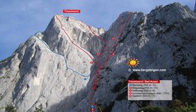 Der Reinlweg ist wesentlich angspruchsvoller als der Stügerweg und führt über oft brüchiges und steinschlagefährdetes Terrain durch die Südwestwand. Es gibt auch einen Kamin in dem der einzige Bohrhaken der Tour steckt. Der Rest ist selbst abzusichern.