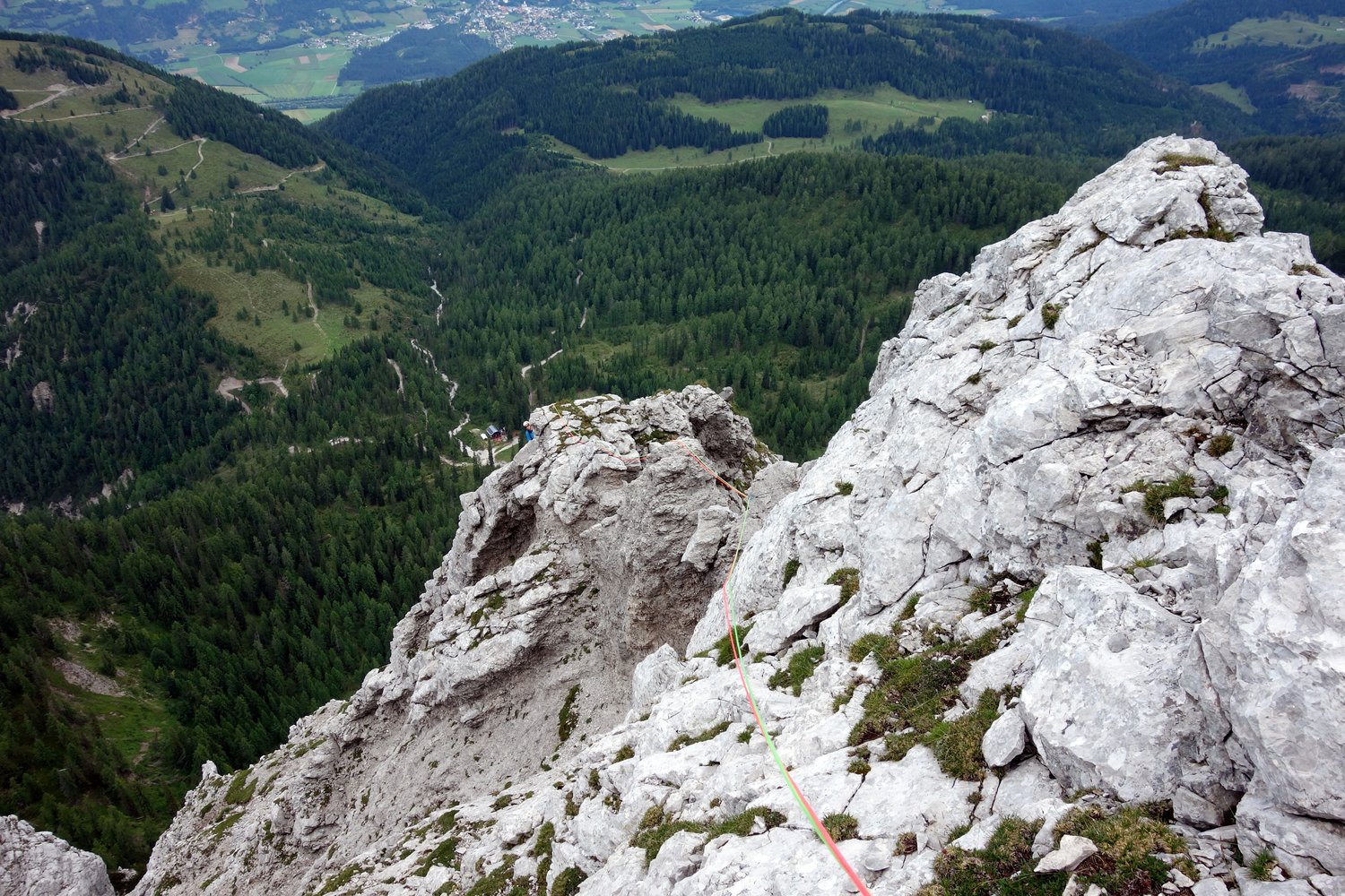 Nach dem Ausstieg am Grat Richtung Westen (2 Bohrhaken), dann nach Süden auf dem Normalweg absteigen. Nun entweder direkt, oder über den kl. Reißkofel (lohnender) absteigen