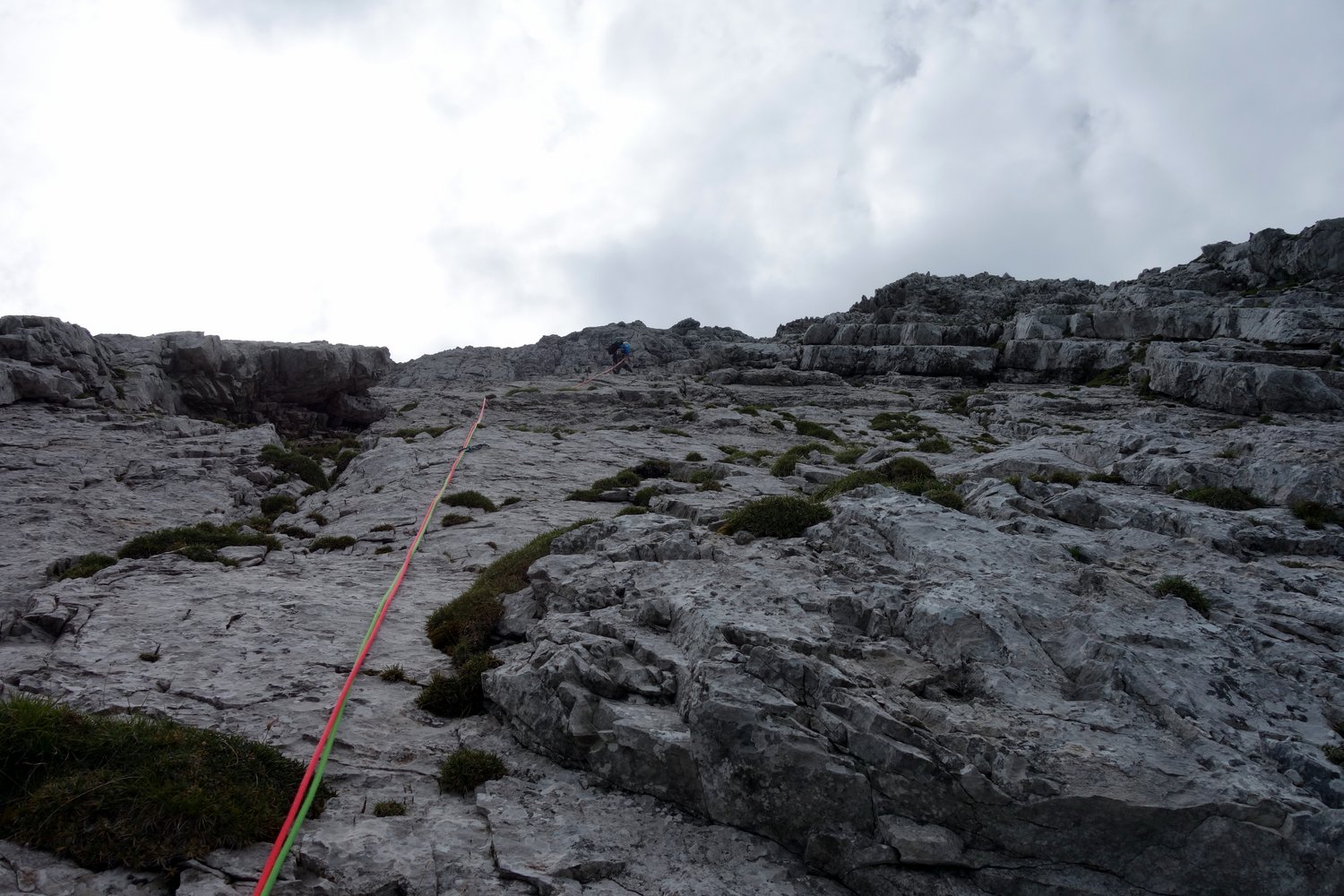 Drei Seillängen stellenweise V, sonst meist IV, IV+