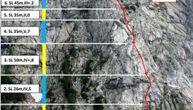 Mit Bohrhaken abgesichert, aber keine Plaisir-Hakenabstände. Routenlänge 680 Meter, Wandhöhe 500 Meter. Standhaken: 2 BH.