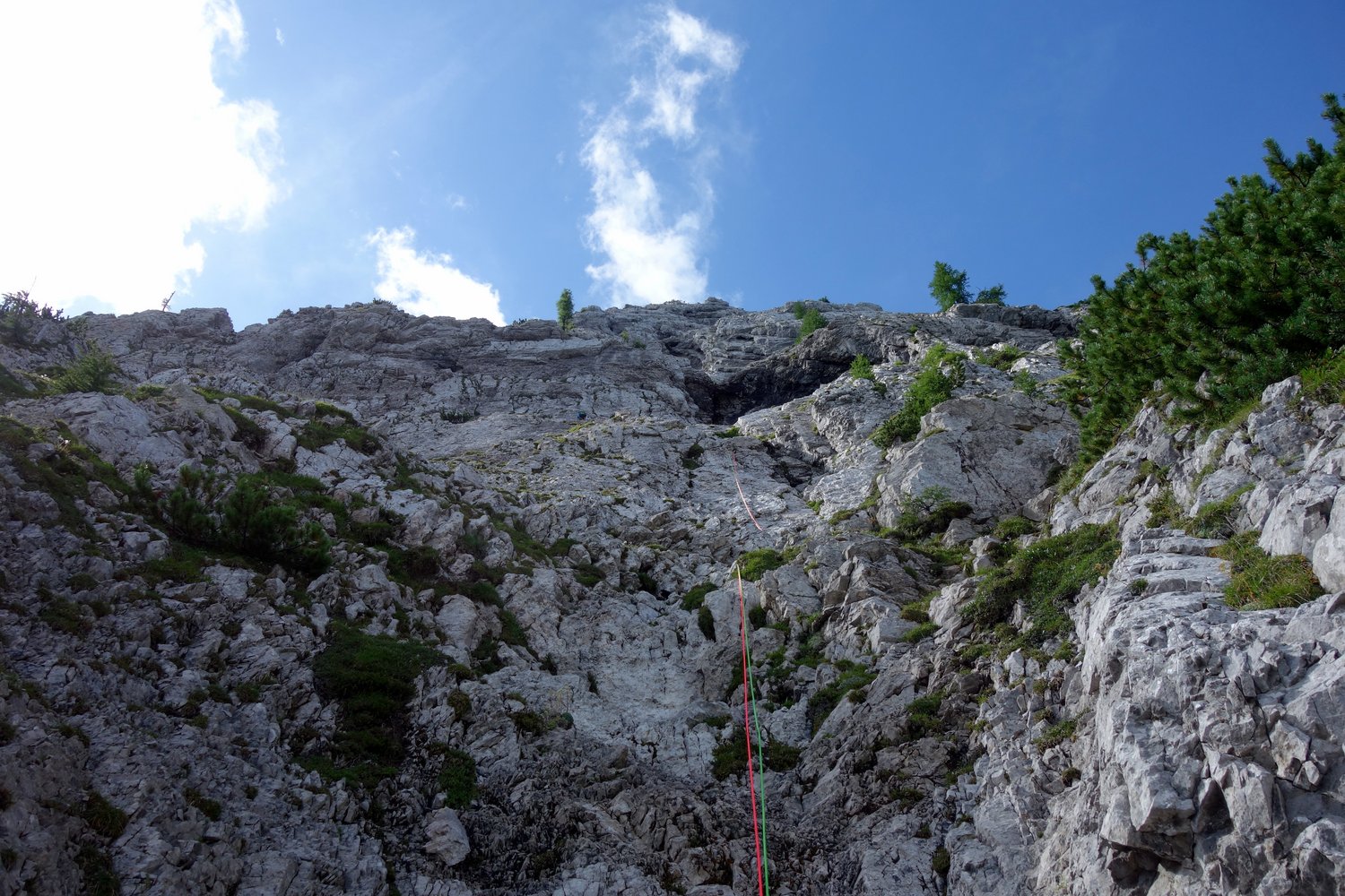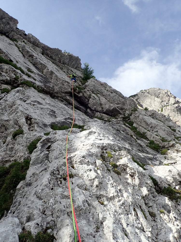 Achtung: Wenn Seilschaften in der Wand sind, herrscht akute Steinschlaggefahr (tlw. brüchiger Fels und Schuttbänder)!