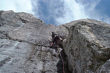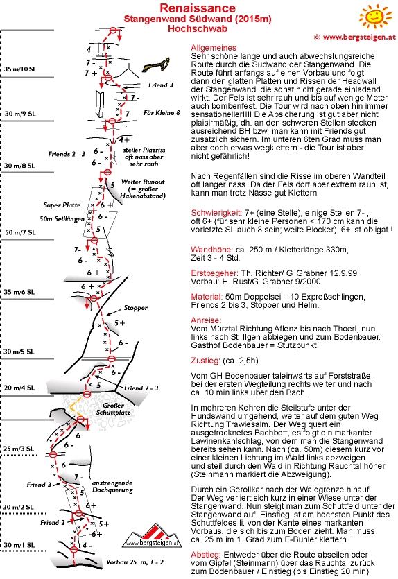 Sehr schöne lange und auch abwechslungsreiche Route durch die Südwand der Stangenwand. Die Route führt anfangs auf einen Vorbau und folgt dann den glatten Platten und Rissen der Headwall der Stangenwand, die sonst nicht gerade einladend wirkt. Der Fels ist sehr rauh und bis auf wenige Meter auch bombenfest. Die Tour wird nach oben hin immer sensationeller!!!! Die Absicherung ist gut aber nicht plaisirmäßig, dh. an den schweren Stellen stecken ausreichend BH bzw. man kann mit Friends gut zusätzlich sichern. Im unteren 6ten Grad muss man aber doch etwas wegklettern - die Tour ist aber nicht gefährlich!