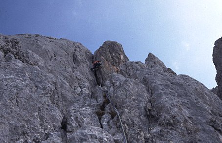 Vom Stand die Schlucht rechts empor bis zu BH (Ringhaken, man kann auch hier Stand machen), 20m II. Nicht weiter die Schlucht hinauf, sondern links über eine gestufte Wand zu Stand bei einem Köpfel direkt an der Kante