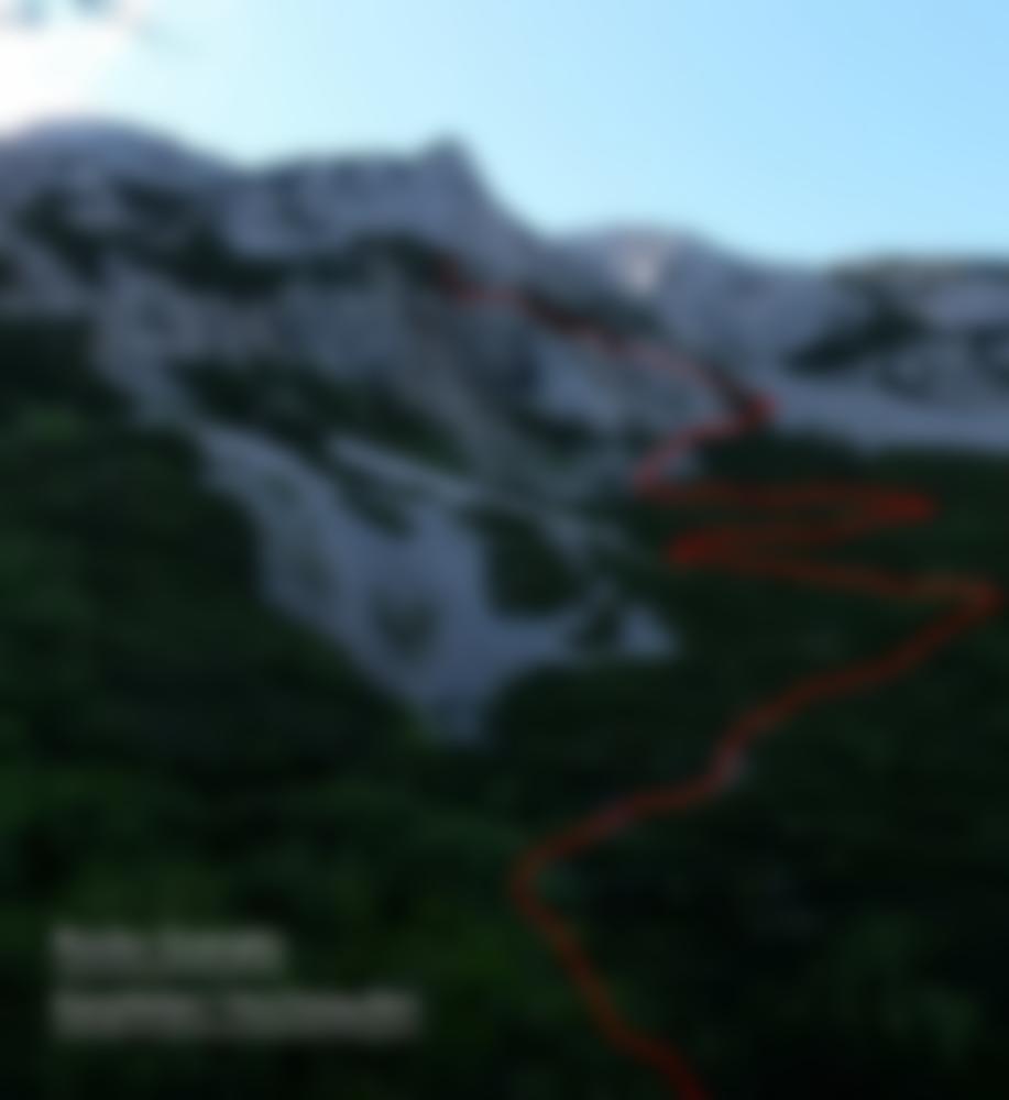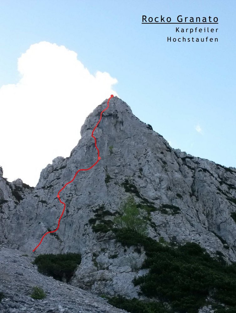 1. SL (6): Einstieg bei Schlaghaken mit Schlinge. Von diesem leicht rechts zum Beginn einer Verschneidung. Diese verfolgen bis sich brüchiger Fels einstellt. Dort nach links über Bauch ausweichend zu Stand. 2. SL (7/6+A0): Gerade hoch, dann Querung unter Bauch. Diesen mittels Blockierer auf richtige Leiste überwinden (A0 mögl.). Nun horizontal rechts noch einige Meter in kniffliger Platte zu Stand um Kante. 3. SL (7-): Riss gerade hoch bis sich dieser verläuft. Dort nach links in 2. beginnenden Riss wechseln. Nicht nach rechts zu rotem Verhauerhaken! Leicht überhängend über Wandl und nach links in leichter werdendes Gelände zu Stand. 4. SL (8/6+A0): Über Rechtsschleife unters Dach. Stark abdrängend aus diesem nach rechts über Leisten auf Henkel. Zuletzt ebenfalls tendenziell rechtshaltend zu Stand.