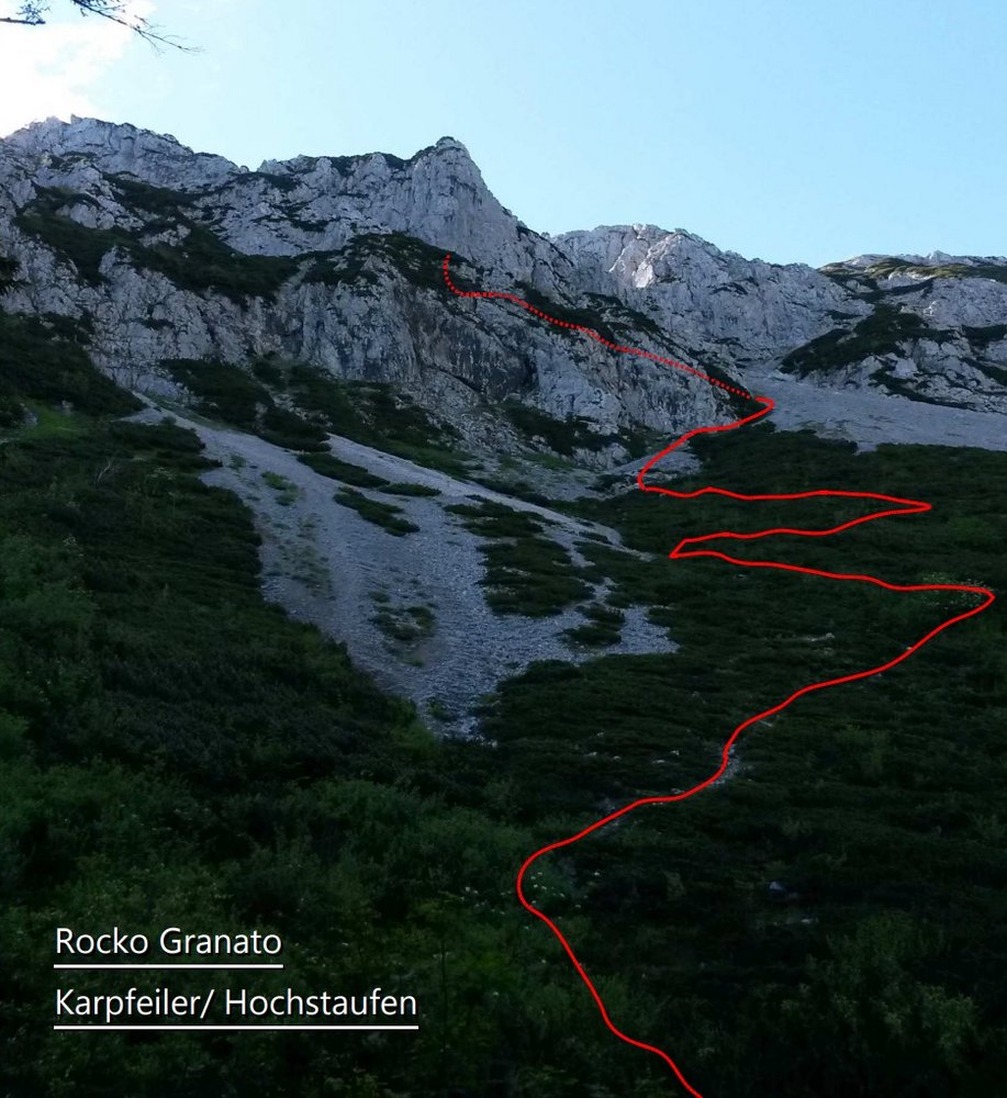 Vom Wanderparkplatz der Forststraße Richtung Steiner Alm folgen. Auf den Almwiesen angekommen kann man hinter der Koch Alm den Abkürzer Richtung Hochstaufen Normalweg wählen, oder den Weg über die Steiner Alm ausgehen. Am Bayrischen Stiegl den Weg bis zum Holzlager vom Staufenwirt folgen. Dort nicht dem Normalweg zum Staufen nach, sondern rechts einen etwas zugewachsenen Forstweg verfolgen, bis man vor dem Staufenkar in den sog. Arzkasten steht. Dort bei alten Grundmauern vorbei und in den beginnenden Knappensteig linkerhand einbiegen. Bei der 2. Rechtsspitzkehre nicht den Steigspuren nach, sondern den Steinmandl in das Blockgelände folgend. Über dieses unter dem 1. Felsriegel und an dessen Wand rechts entlang, bis ein kleines Kar Richtung Karpfeiler zieht. Dieses zuletzt etwas mühsam hoch. Tipp: Mit Radl bis zur Steiner Alm.