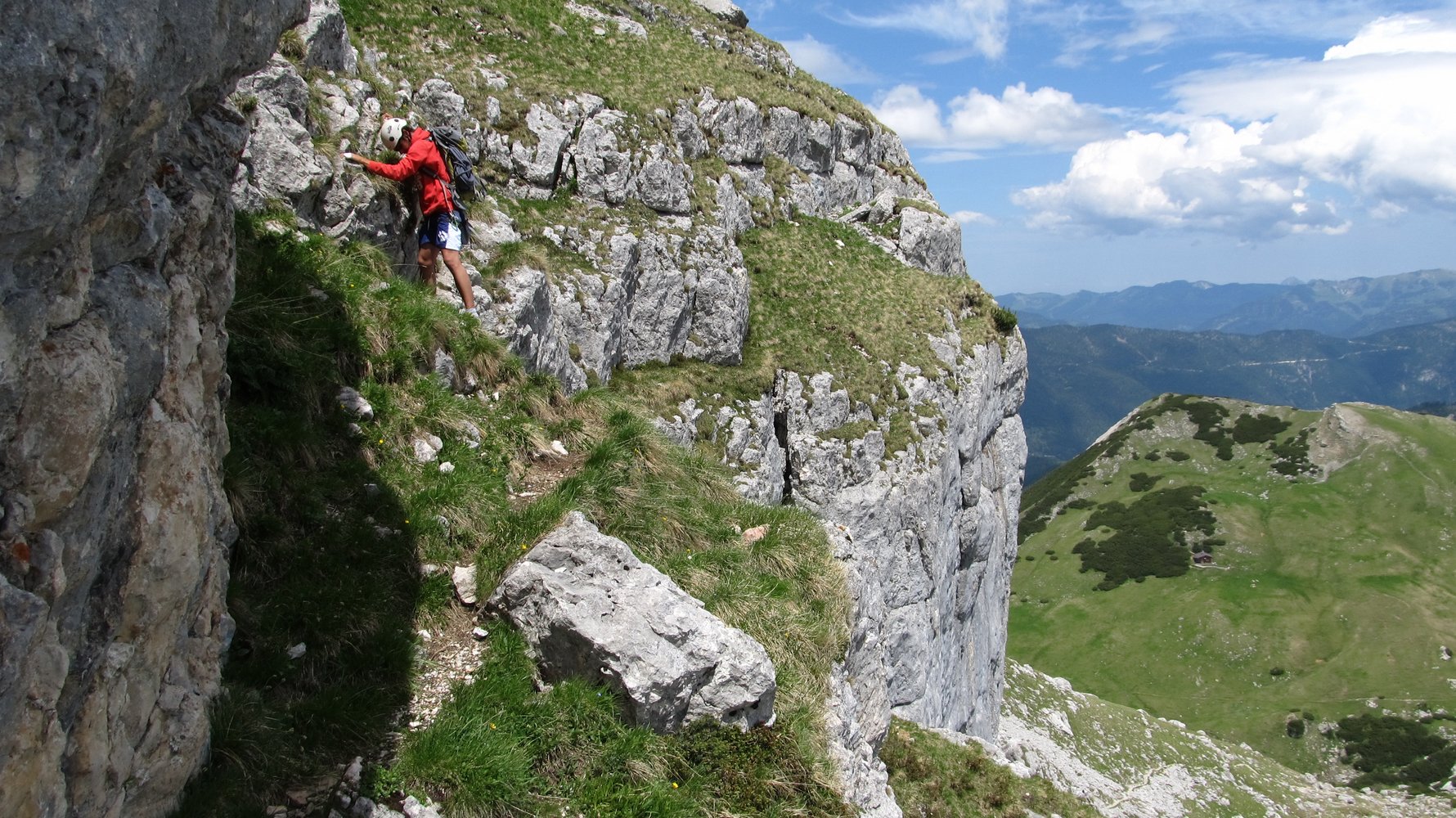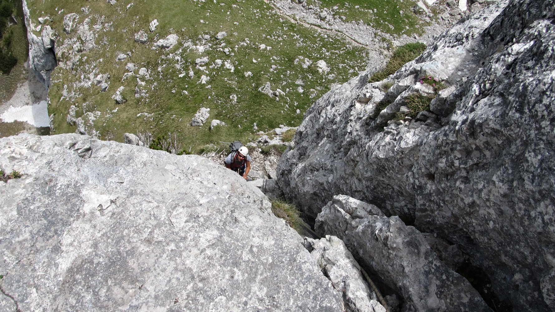 Über die Route abseilen oder über das Grasband (bei Nässe gefährlich) zum Normalweg absteigen und über diesen zurück zum Einstieg.