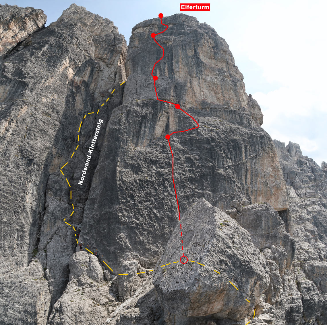 Vom Gipfel des Westlichen Elferturms über den Klettersteig (steil!) hinunter in einen Kessel. Dann der Markierung folgen (zuerst durch einen Durchschlupf) und über div. Kletterstellen (Sicherungen B/C und 1+) zum Kamm, der Verbindung zwischen Elfertürmen und Elferspitze. Dort auf markiertem Weg in nördlicher Richtung zur Elferhütte zurück.