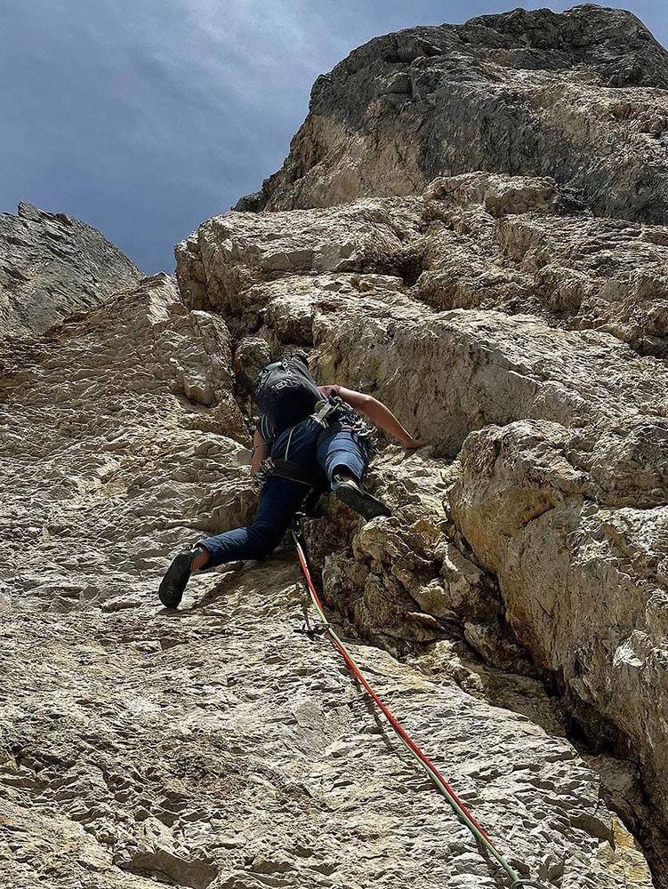 Die Tour ist mit Bohrhaken gut saniert, nur in den leichteren Passagen sind die Abstände etwas weiter. Dort kann man je nach Bedarf mit Friends nachbessern.