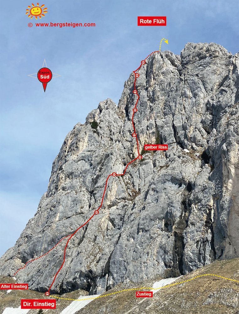 Vom Parkplatz auf dem Wanderweg zum Gimpelhaus, kurz nach der Hütte hält man sich aber links und steigt auf einem Pfad hinauf in Richtung Hochwiesler. Dann quert man den gesamten Wandfuß nach links bis unter die Südabbrüche der Roten Flüh. Der direkte Einstieg befindet sich an einer plattenartigen Verschneidung bei einer alten Schlinge, links ist der originale Einstieg an einer Rampe, rechts von einer Gedenktafel (siehe Topo und Übersichtsbild).