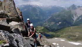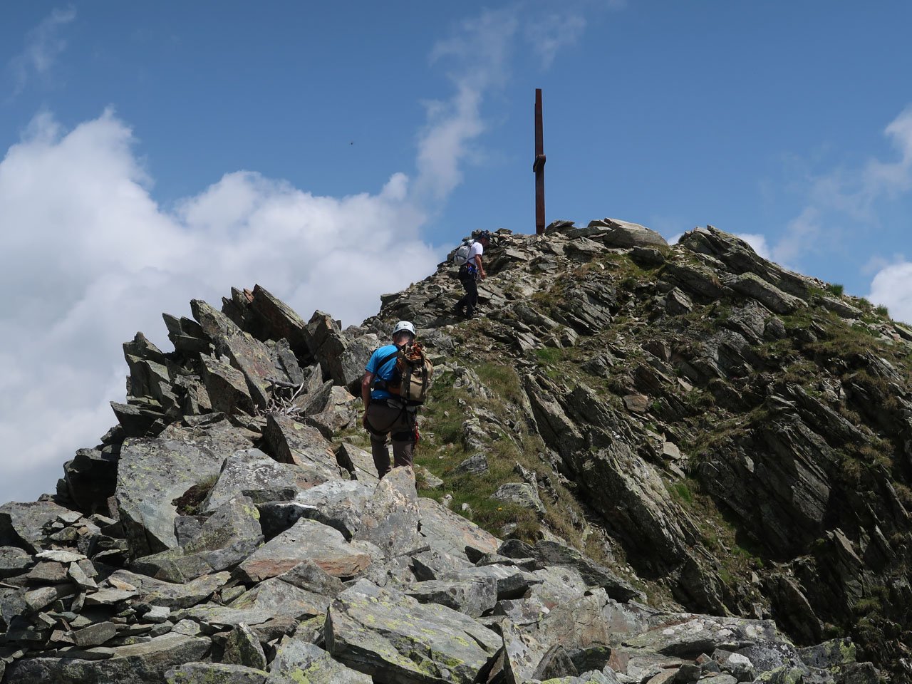 Nun weiter am teilweise ausgesetzten Grat (1+) oder diesen etwas mühsam im Geröll nordöstlich umgehen. Den Steigspuren folgend meist direkt am Grat oder knapp daneben im Gehgelände oder ganz leichter Kletterei (1-) zur Schlüsselstelle aufsteigen. Die Steilstufe (2-) ist in der Mitte mit einem sehr dicken Stahlseil entschärft, kann aber auch weiter links in einer brüchigen Rinne (1+) oder weiter rechts (2) erklommen werden.