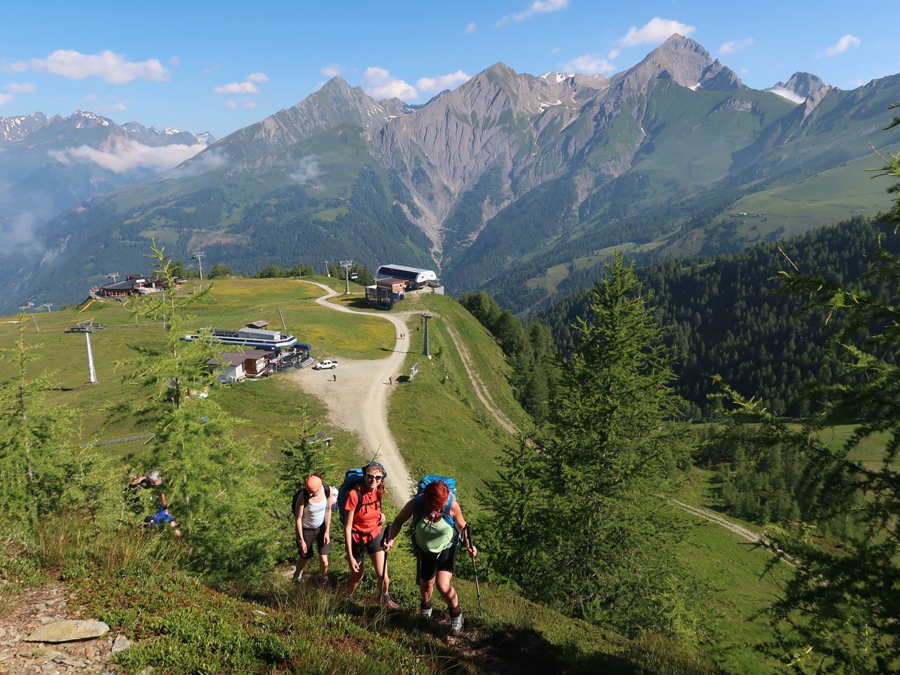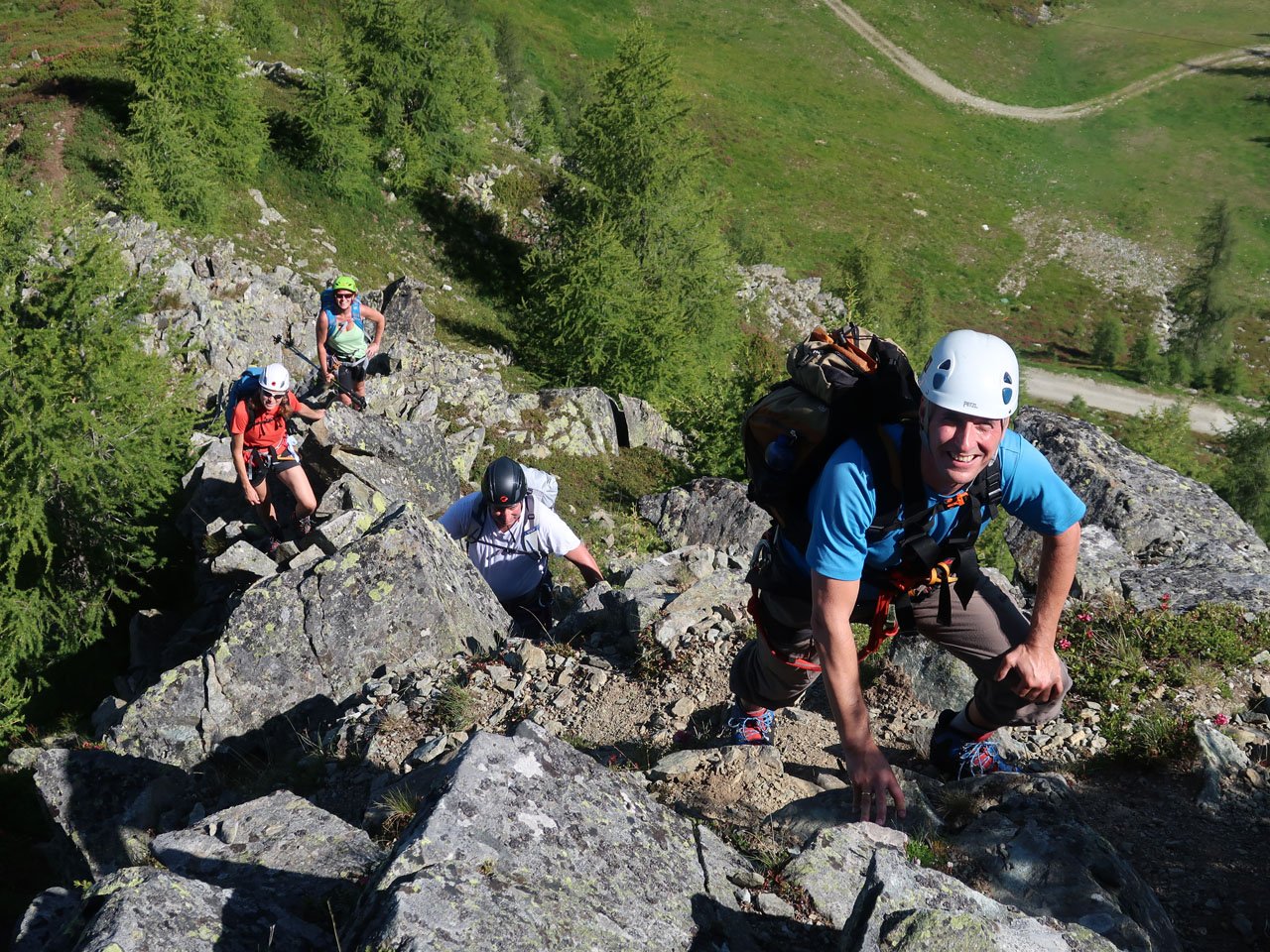 Von der Bergstation der Goldriedbahn zum Fuß des bereits sichtbaren Bunköpfls und auf deutlichen Steigspuren zu einer ebenen Wiese aufsteigen. Hier Beginn der leichten Kletterstellen.