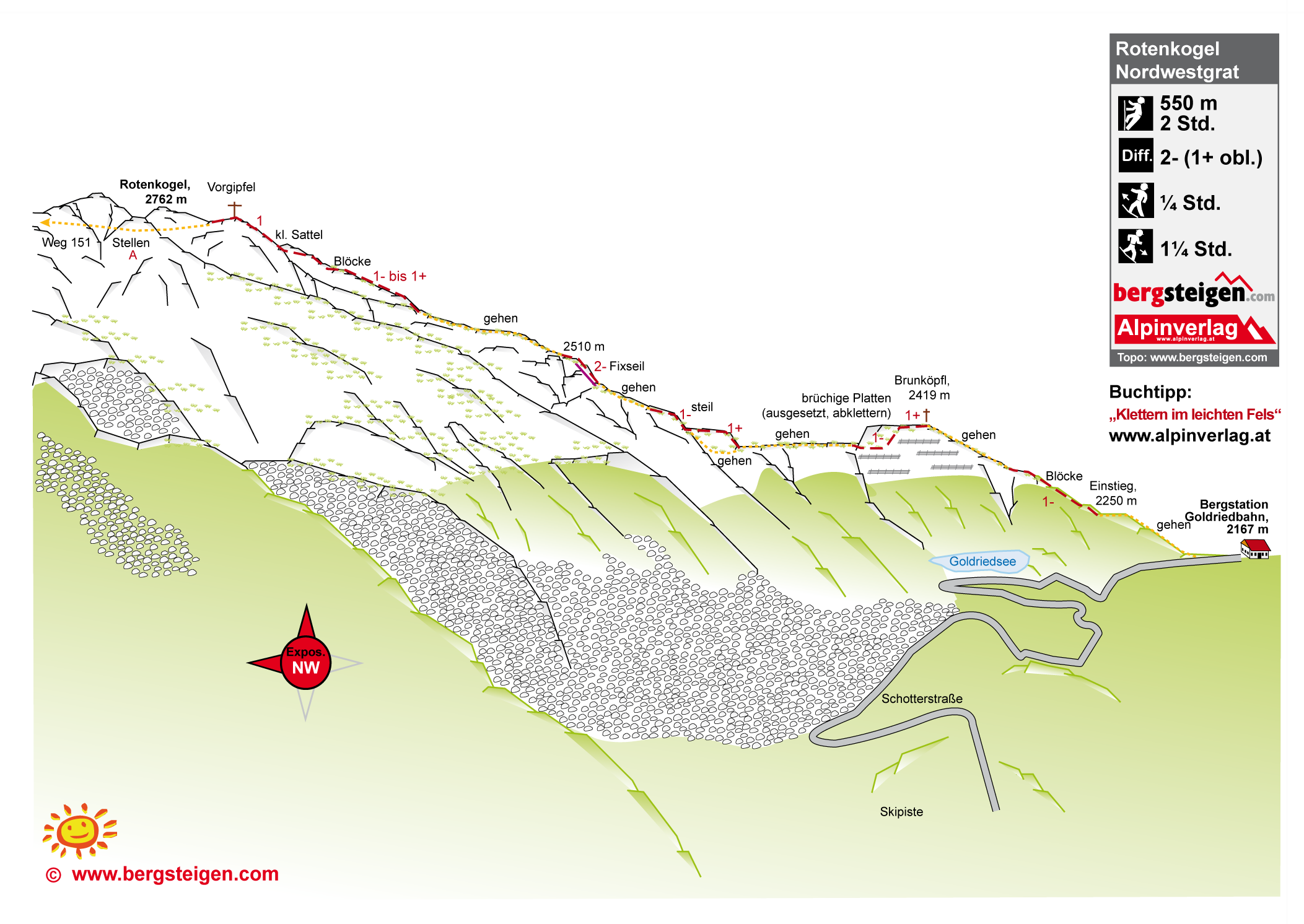 Der Rotenkogel bildet den südlichsten Ausläufer der Granatspitzgruppe. Sein Gipfel liegt fast 2000 Hm oberhalb des Iseltals und eröffnet herrliche Blicke zum Großglockner. Der Nordwestgrat des Rotenkogels, der sich von der Bergstation der Goldriedbahn über das Bunköpfl etwa 2 km lang erstreckt, ist eine Mischung aus anspruchsvoller Hochgebirgswanderung und leichter Kletterei. Einzelne Stellen sind durchaus exponiert und verlangen Trittsicherheit.