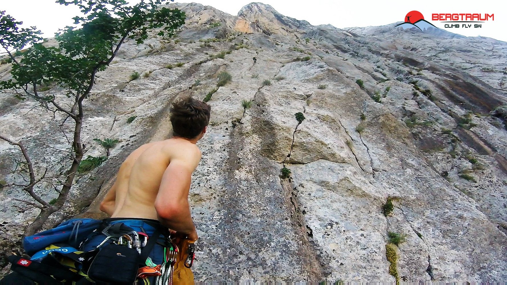 Bis auf die Seillängen 3-5 (da gibt’s gute bolts als Zwischensicherungen) sind alle anderen Längen nichts für schwache Nerven: speziell die oberen beiden 6a- Längen haben außer alten NH und wackeligen Holzkeilen nichts solides zu bieten. Ein Satz friends und lange Sanduhrschlingen sind dort Gold wert!