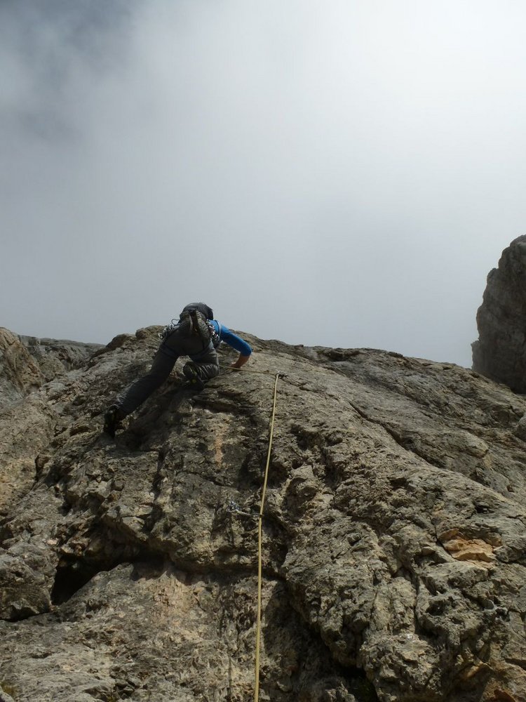 Abseilen über Abseilpiste (4 mal 30m; siehe Topo) oder über Klettersteig 'Crete Rosse' absteigen. Dann wie Aufstieg.