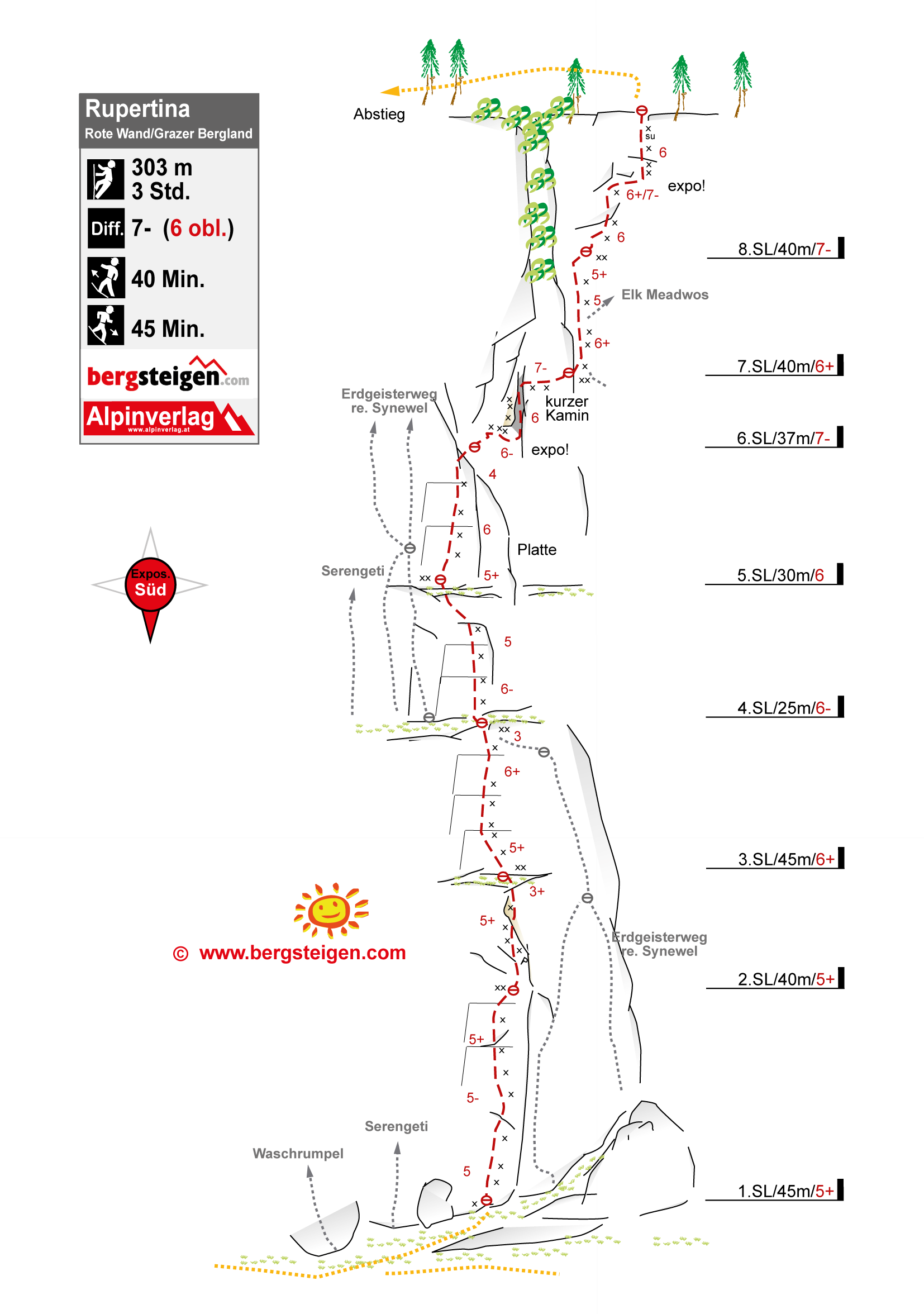 Schöne, abwechslungsreiche Route an der Roten Wand, die sich zum Klassiker entwickelt hat. Die Route wird nach oben hin steiler und auch schwieriger.